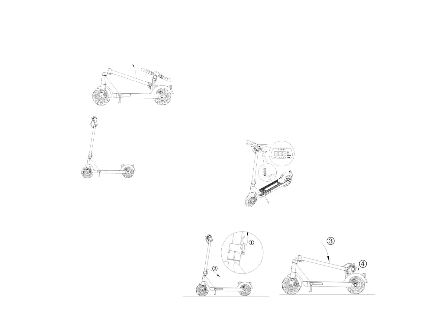Varmista ennen SO4:n / SO4 PROn taittamista, että potkulaudan virta on katkaistu. Paina solkea kuten kuvassa ja työnnä vipua alaspäin. Taita etutanko alas takalokasuojaan kiinni ja