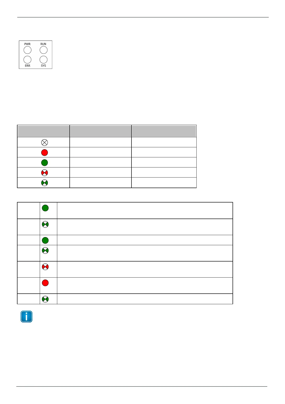 The LEDs may be on permanently or flash in different colors and frequencies. We use the following symbols: