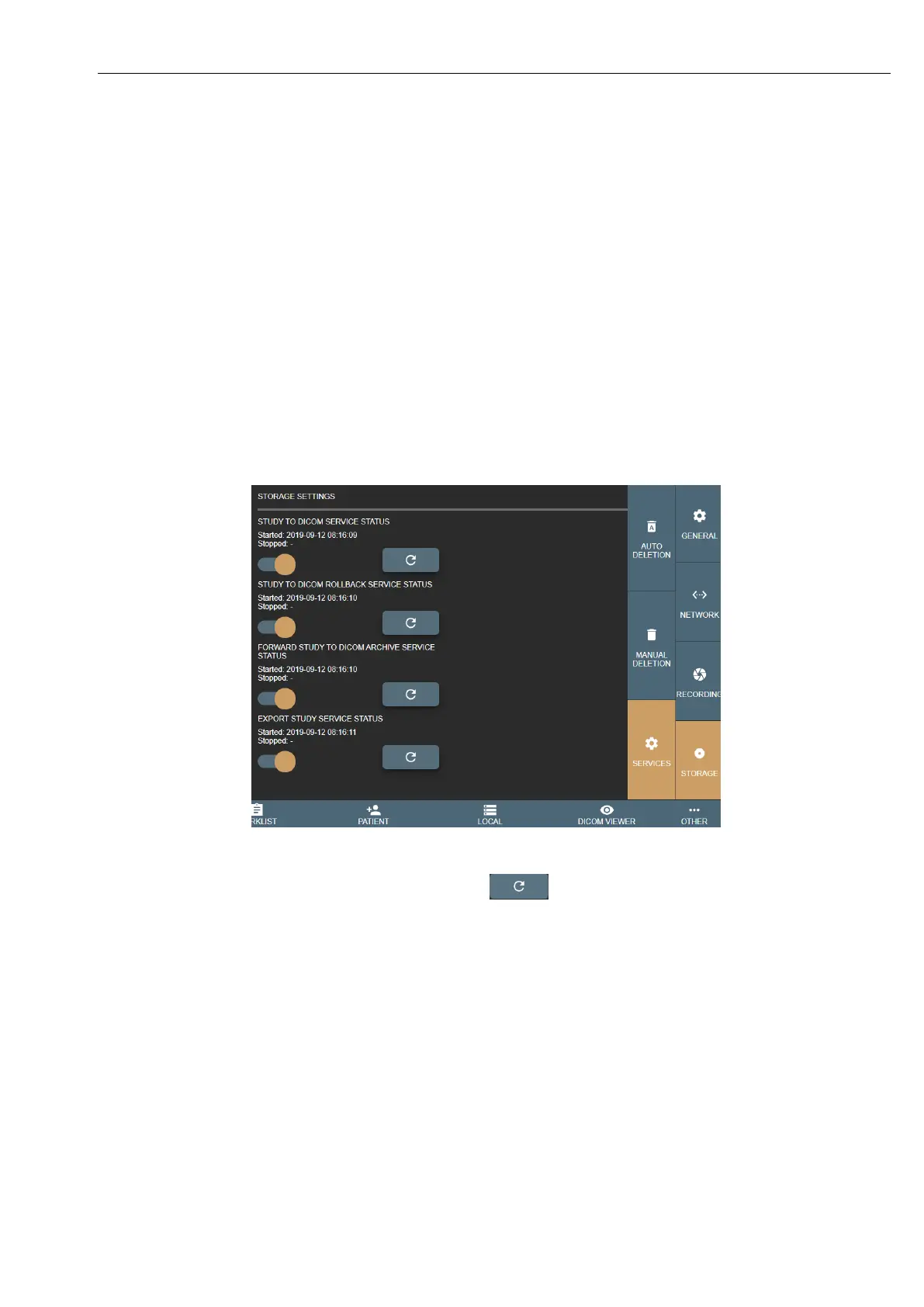 • STUDY TO DICOM SERVICE STATUS – responsible to save (convert to DICOM) studies, recommended always