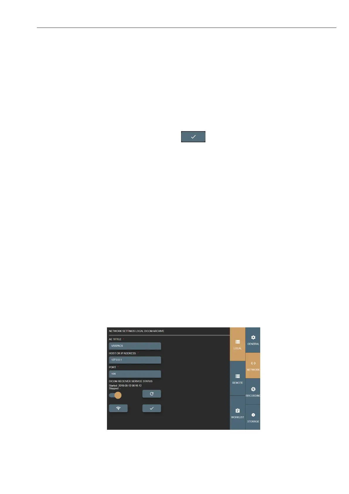 • DICOM RECEIVER SERVICE STATUS – will show receiver status (start/stop date and time). Also, you can turn