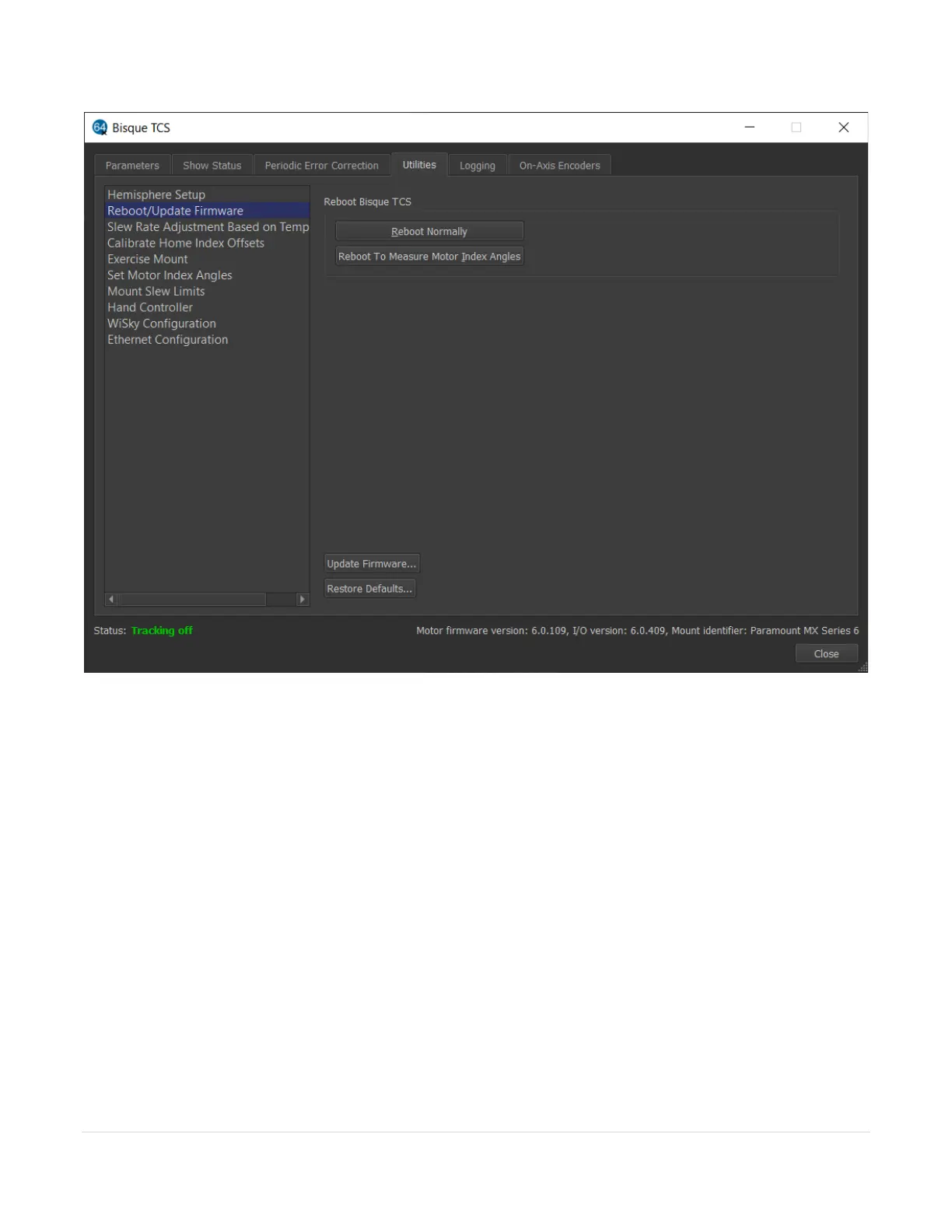 Click this button to restart the control system so that the mount’s motor index angles can be measured. The