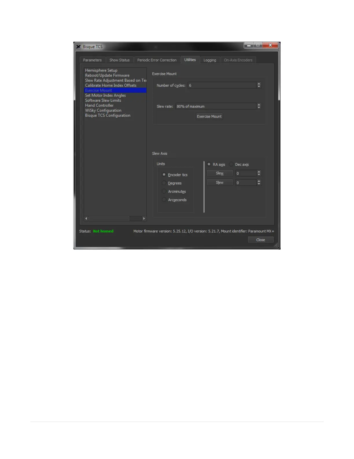 Figure 70: The Exercise Mount settings window on the Utilities tab.