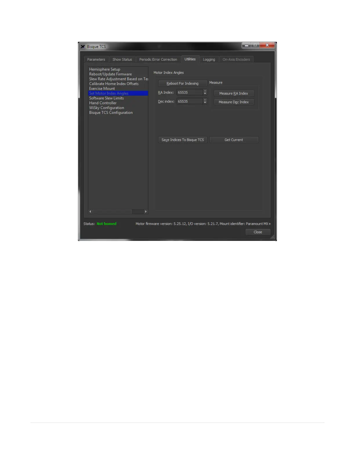 Click the button to save the RA Index and Dec Index motor index angles to the Bisque TCS firmware. The motors