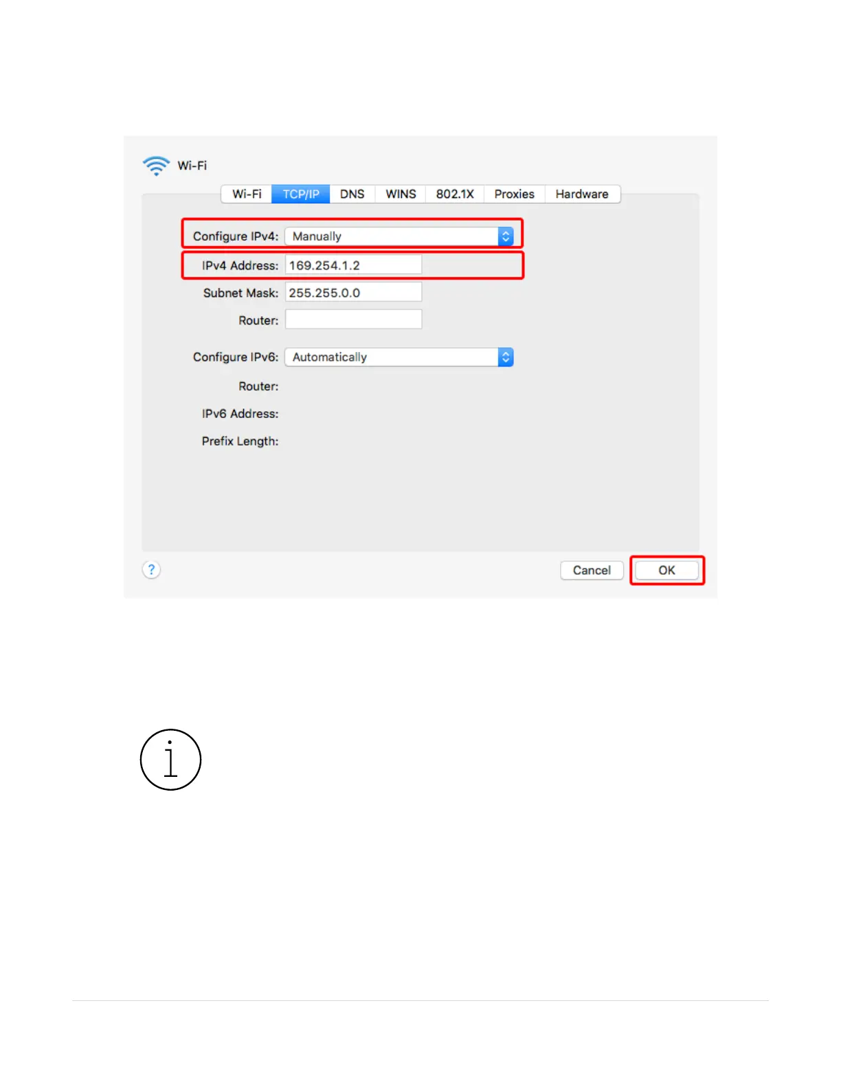 b. Enter 169.254.1.2 for the IPv4 Address and click OK.