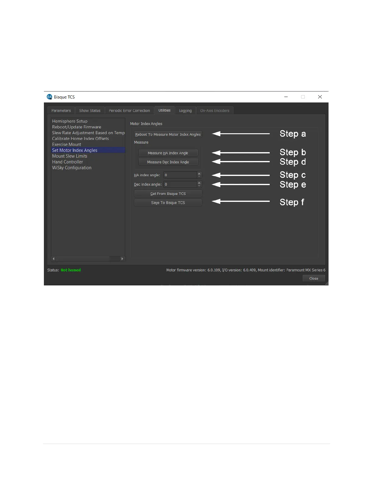 Figure 85: Follow Steps a-f to measure and save the motor index angles for both axes.