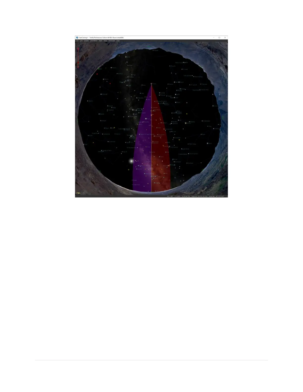 Figure 5: TheSky Professional showing overhead view with the purple and red meridian regions.