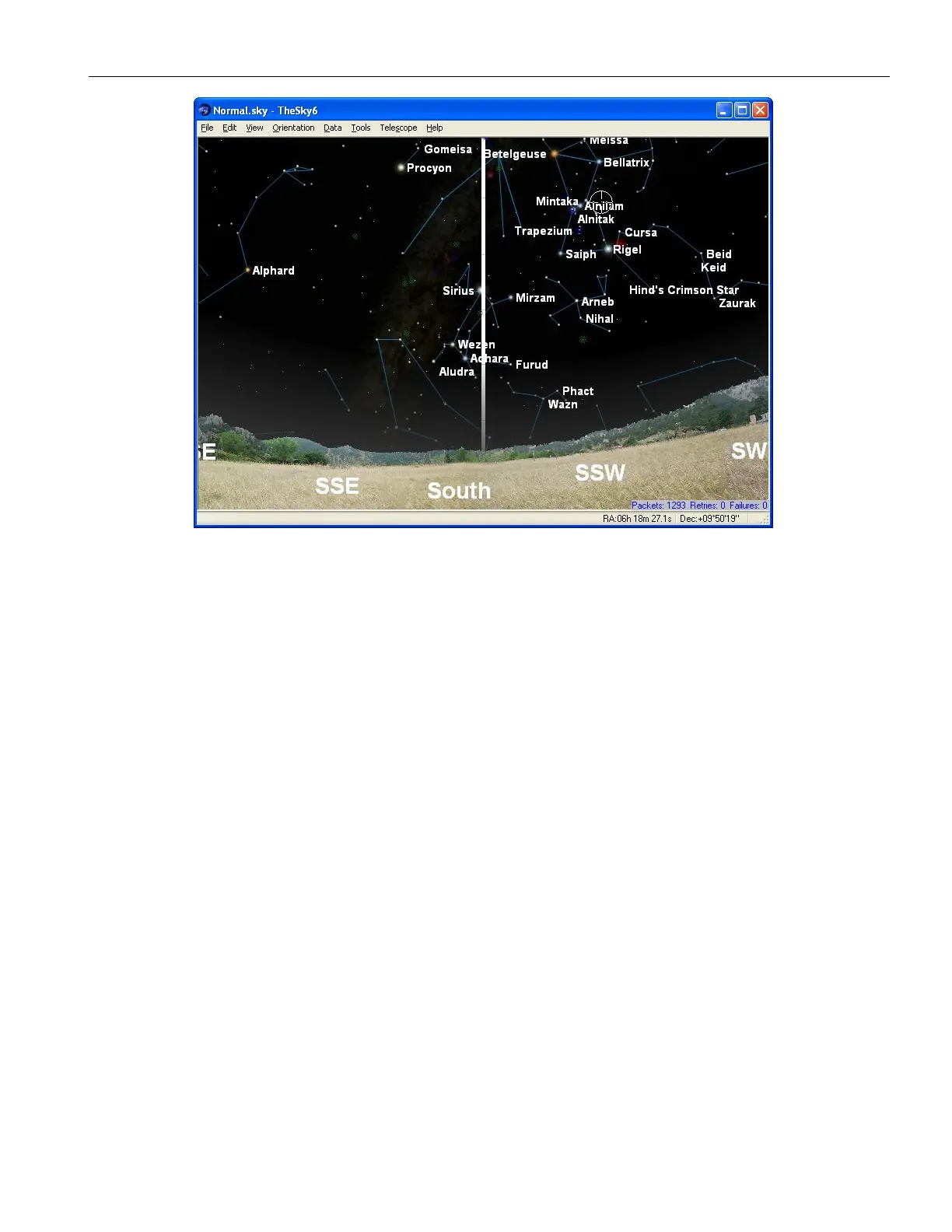 Figure 50: TheSky6 Professional Edition looking south with the meridian turned on.