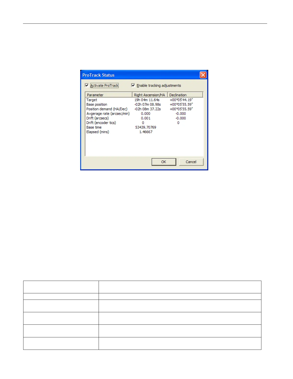 Figure 56: TheSky6 Professional Edition’s ProTrack Status dialog box.