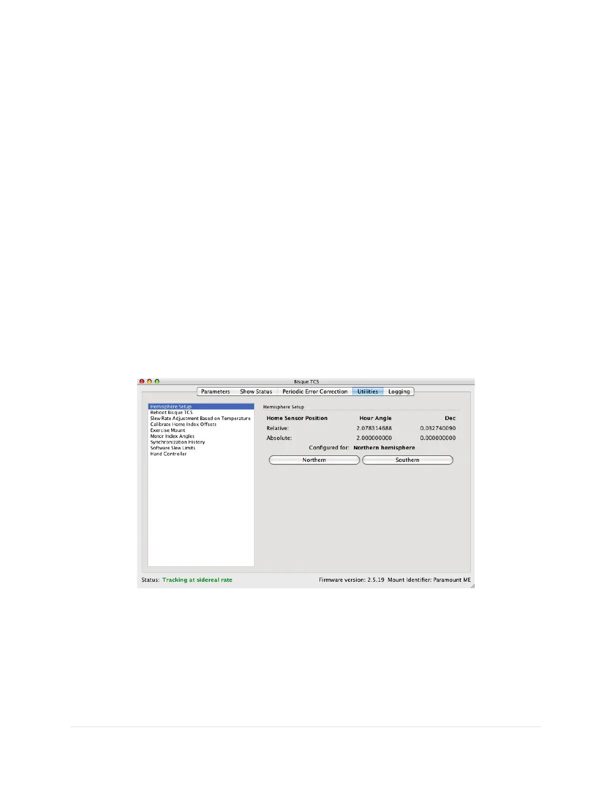 Click the Hemisphere Setup text on the right side of the Utilities tab to configure the mount’s tracking