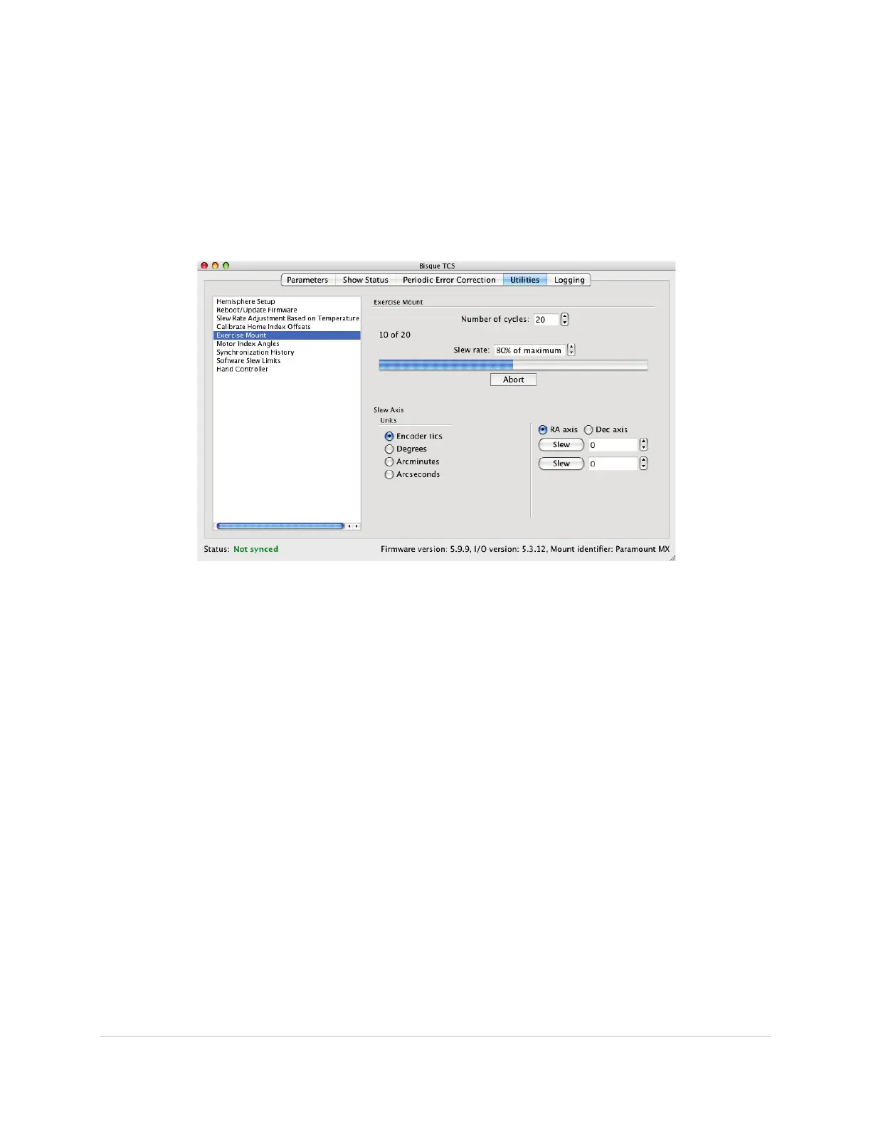 • Exercising slews both mount axes from limit to limit at the current Slew Rate, specified as a