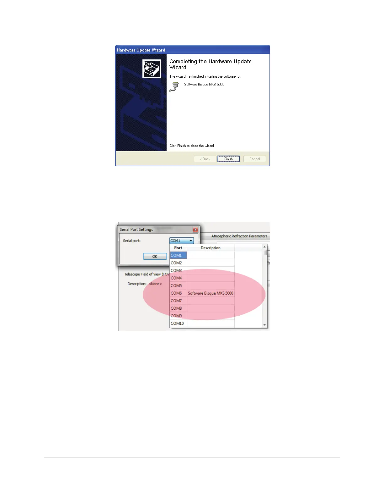 Figure 70: Selecting the COM port from TheSkyX Professional Edition.