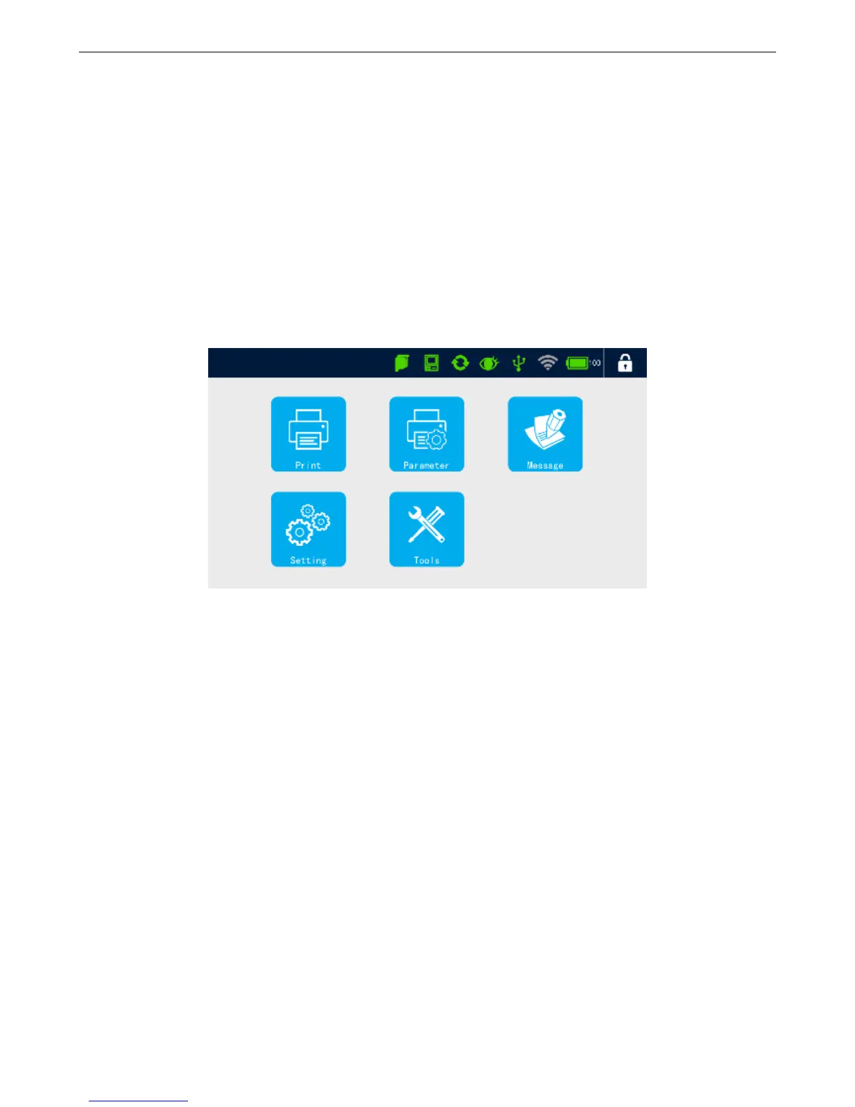 Status bar: Status of ink, equipment, encoder, photocell, USB, WI-FI, power and log off.