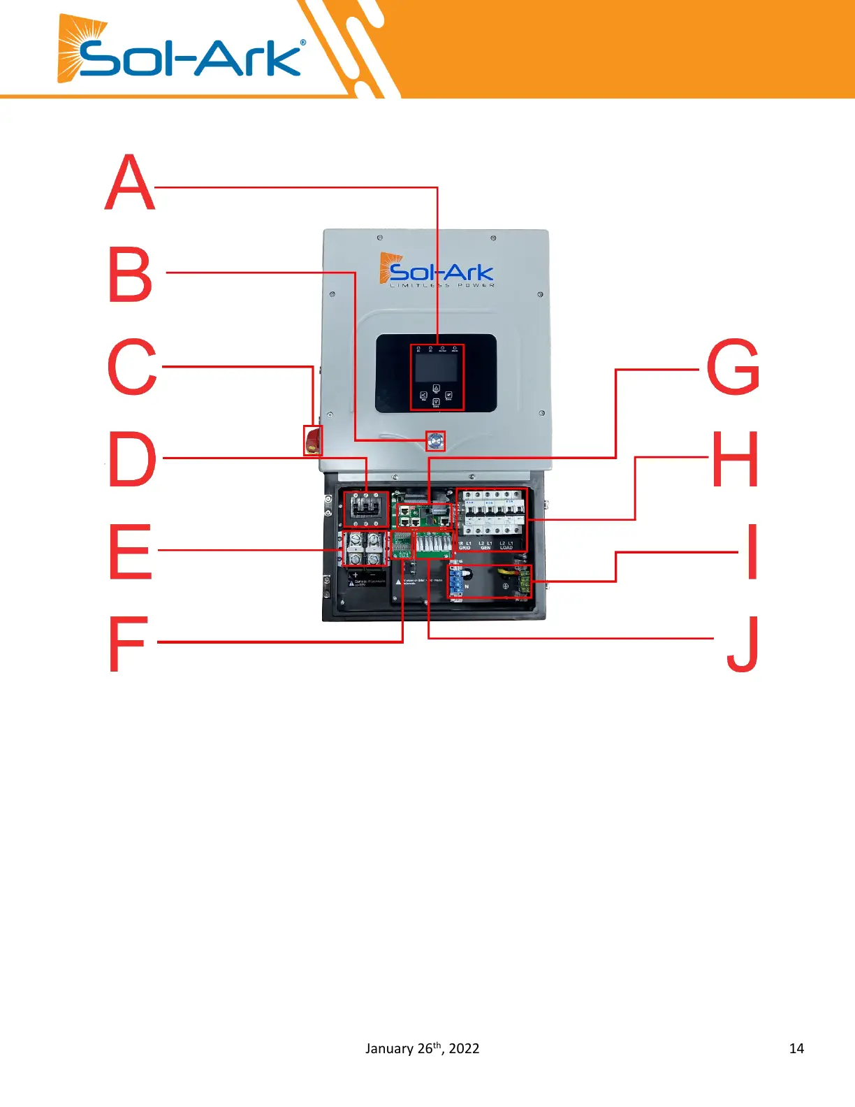 E. Battery Terminals (+/-) J. MPPT Charge Controllers