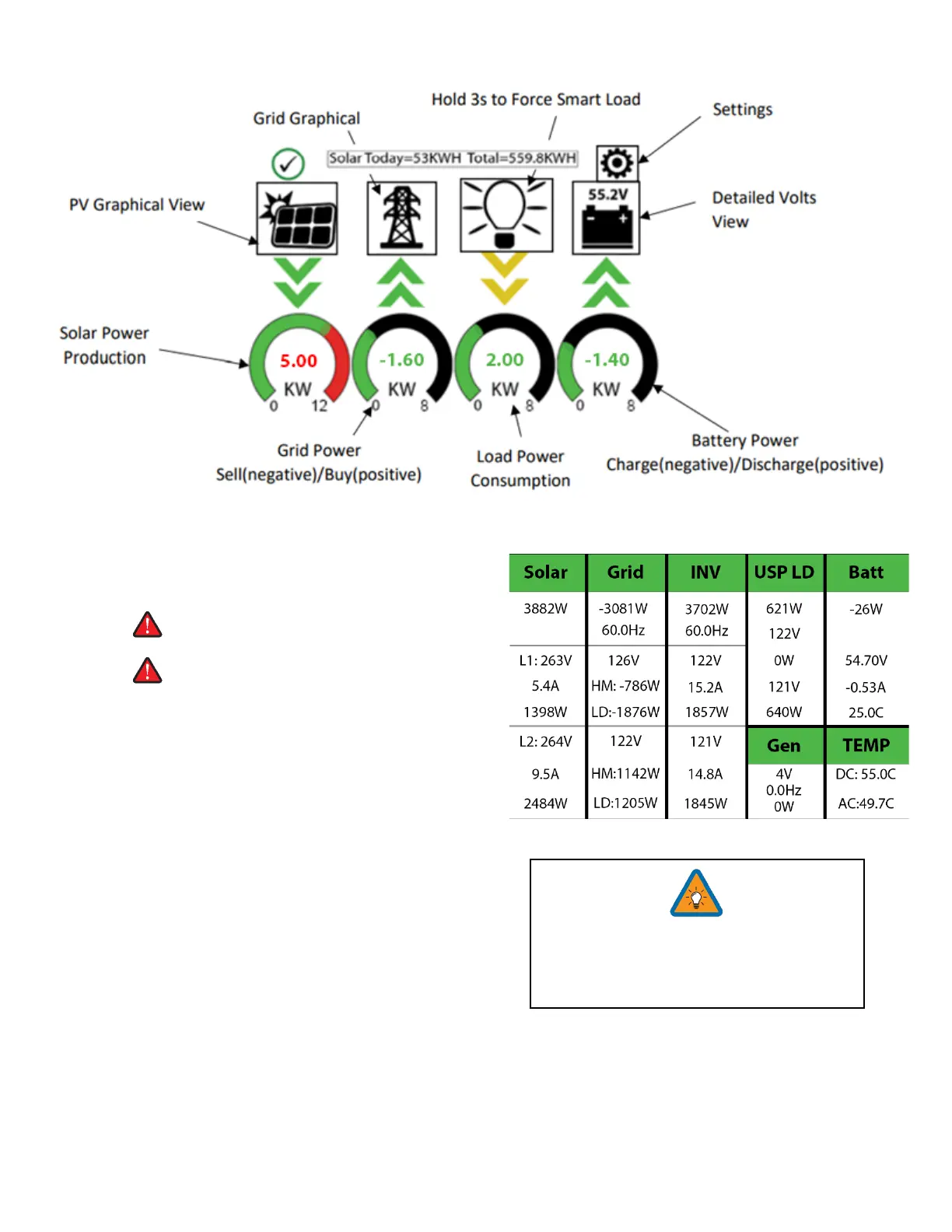 • Bottom Row = Line 2/PV2 voltage, Amps, and Watts