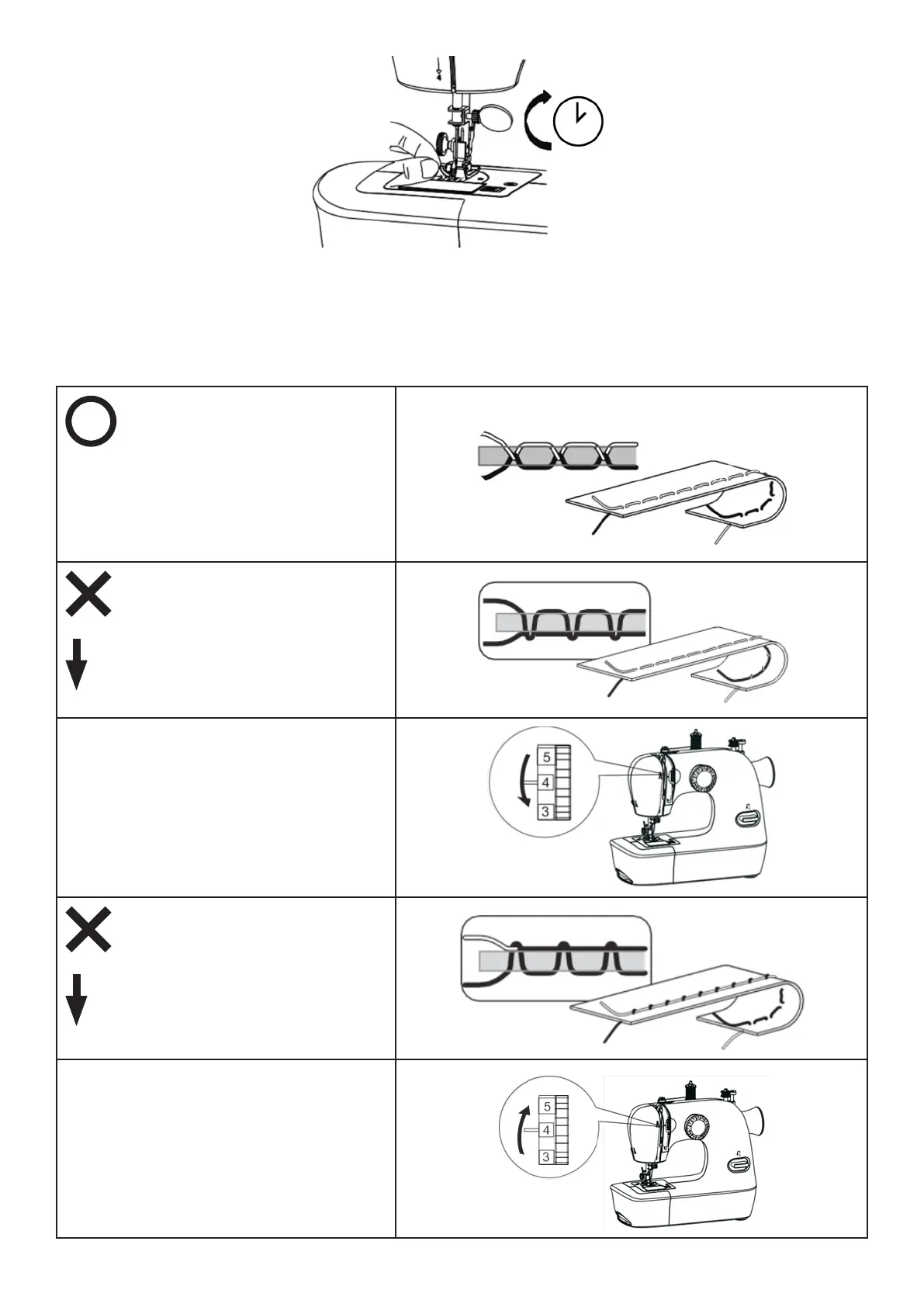 Para pontos normais, a linha superior da linha da bobina atravessa o tecido.