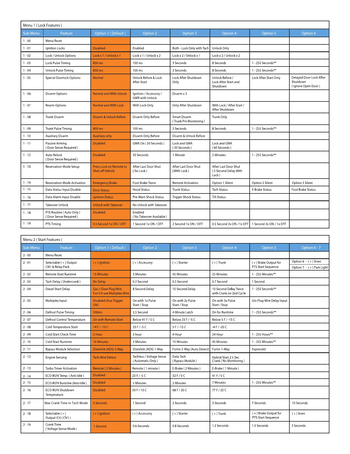 Solace i Series - Menu 1: Lock Features; Menu 2: Start Features