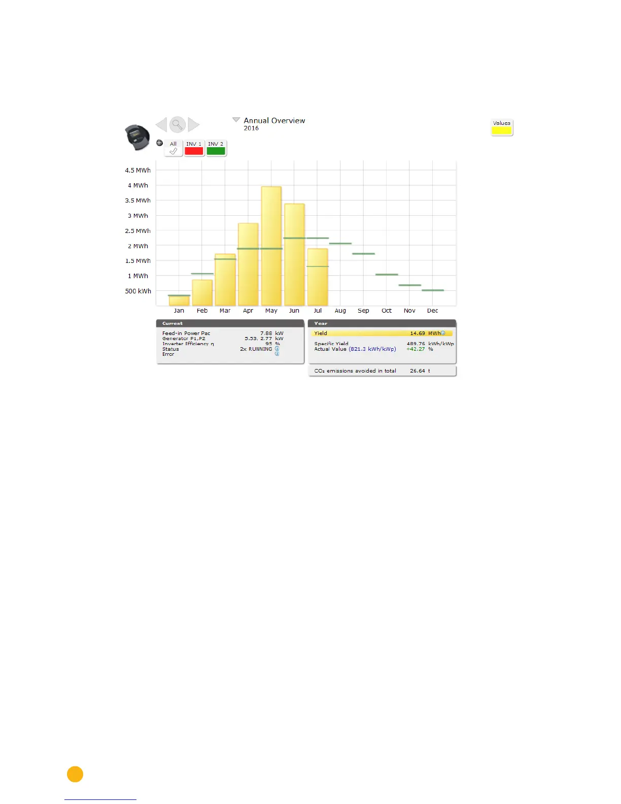 The monthly yields from a year are displayed as a total in a bar graph. The dark green lines indicate the