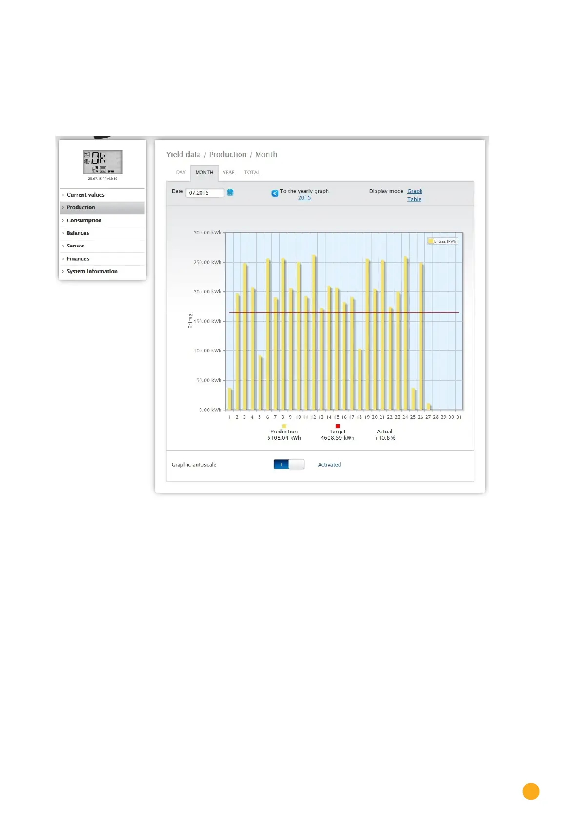 The tab Month displays the daily yields from the month as a total in a bar graph.