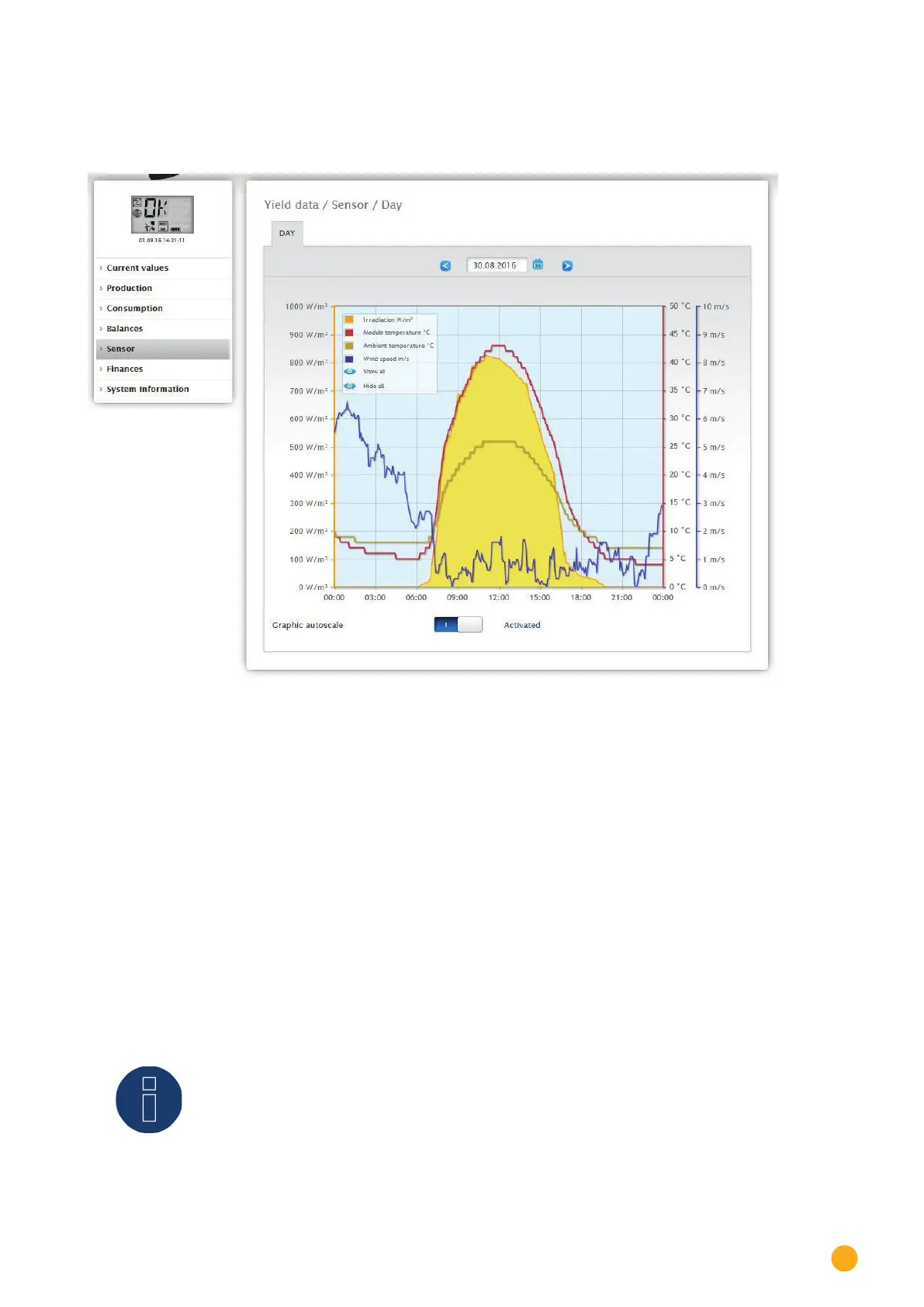 A graphic evaluation from the connected sensors can be displayed from the Senor menu.