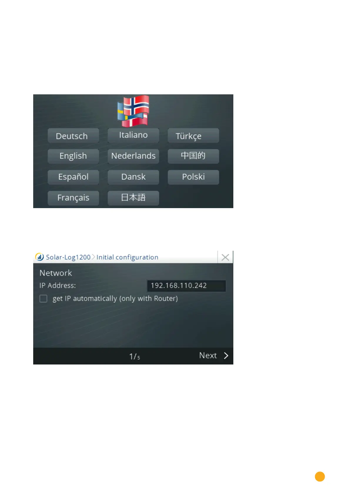 Solar-Log 250 - Fig.: Display: Initial Configuration Language Selection; Fig.: Display: IP Address Settings in the Initial Configuration