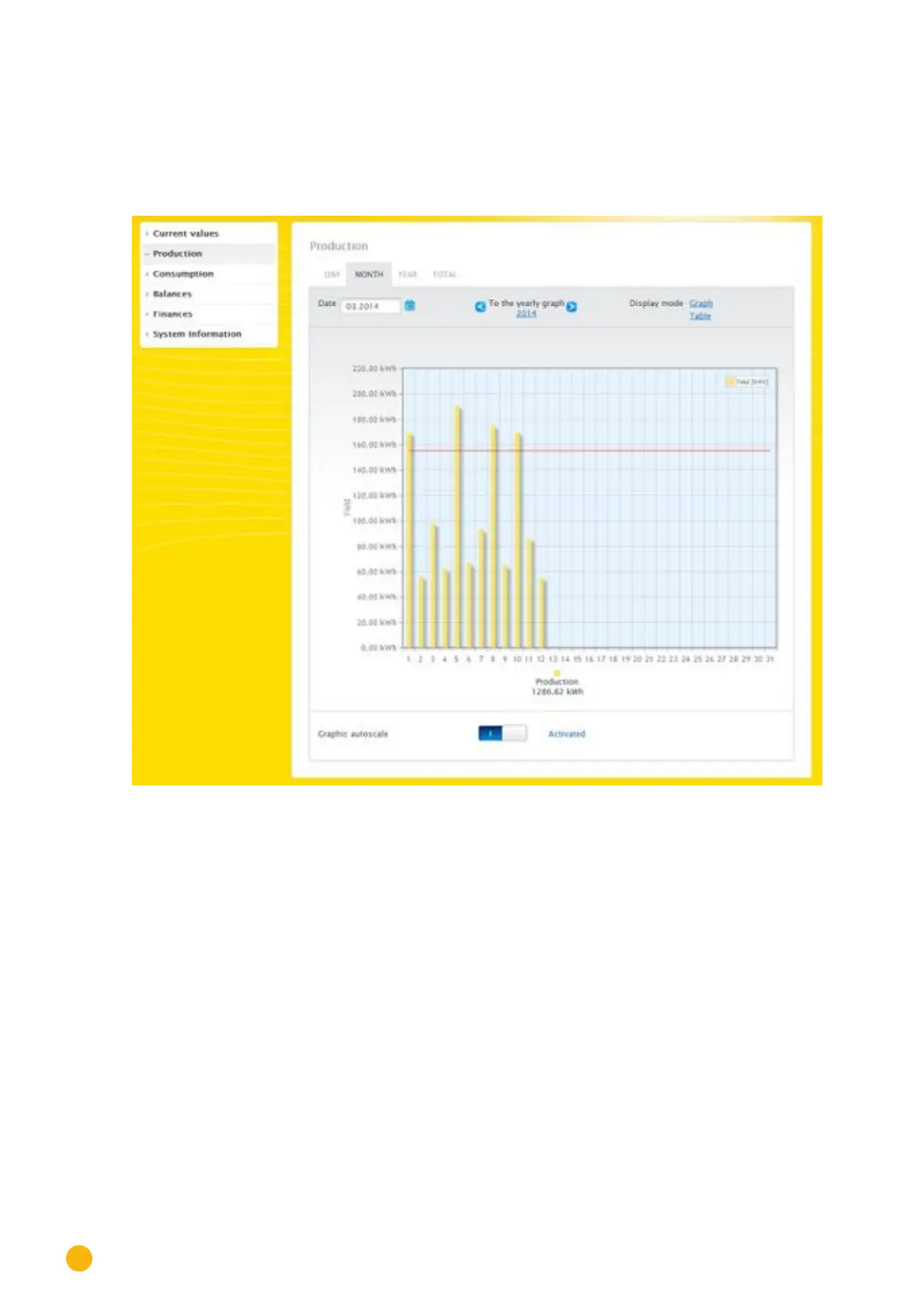 The daily yield can be displayed by moving the mouse above one of the bars.