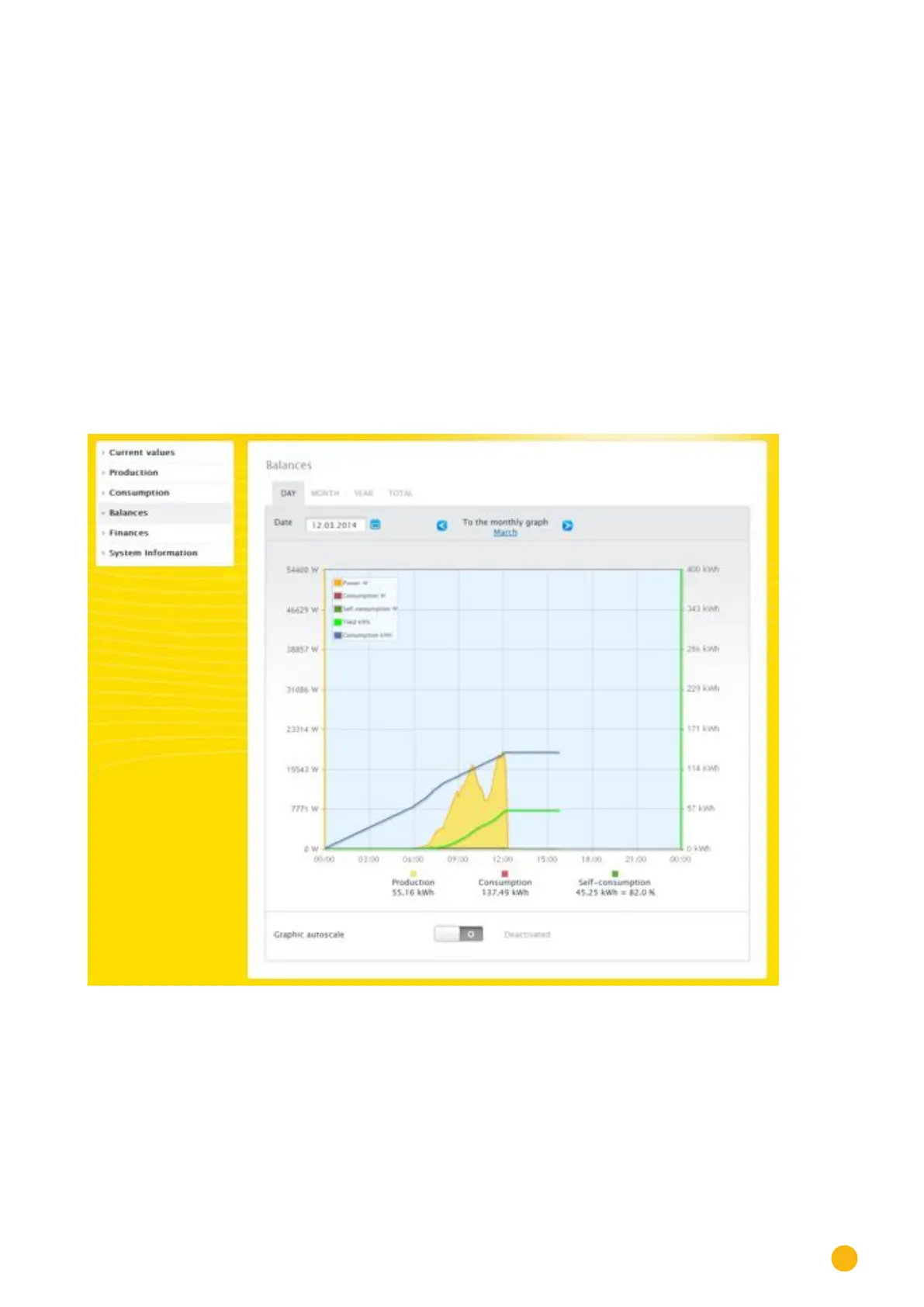 The green areas display the amount of consumption that was covered with PV power. The yellow areas