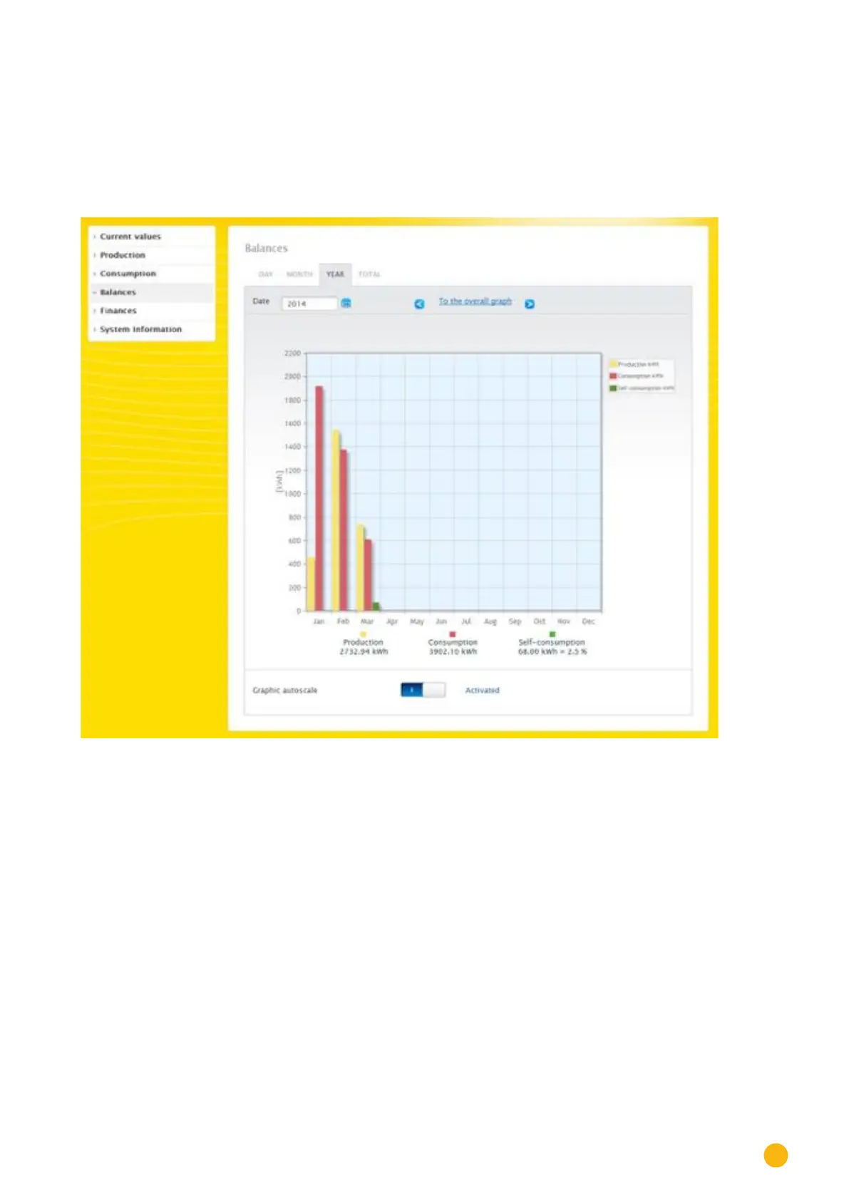Move the mouse above one of the bars to view either the monthly yield or consumption with a
