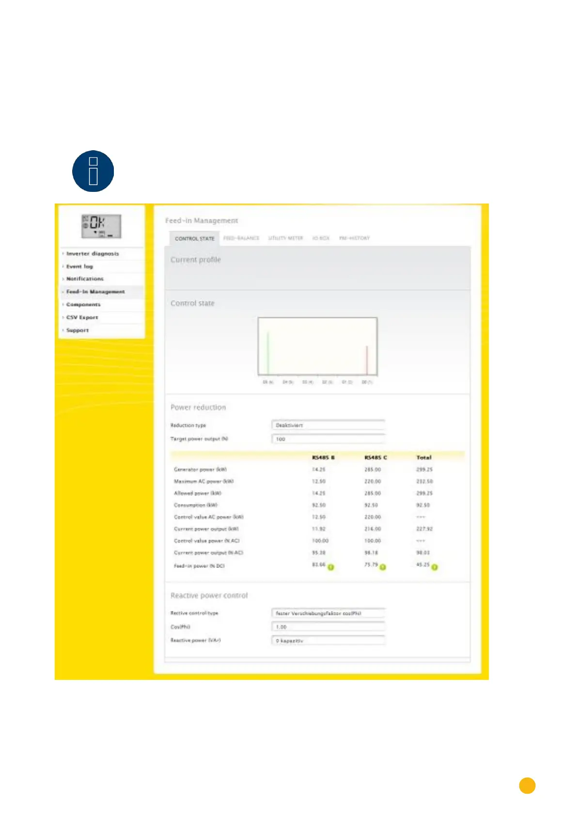 The inverter control can be analyzed and adjusted in the Diagnostic | Feed-In Management settings sec-