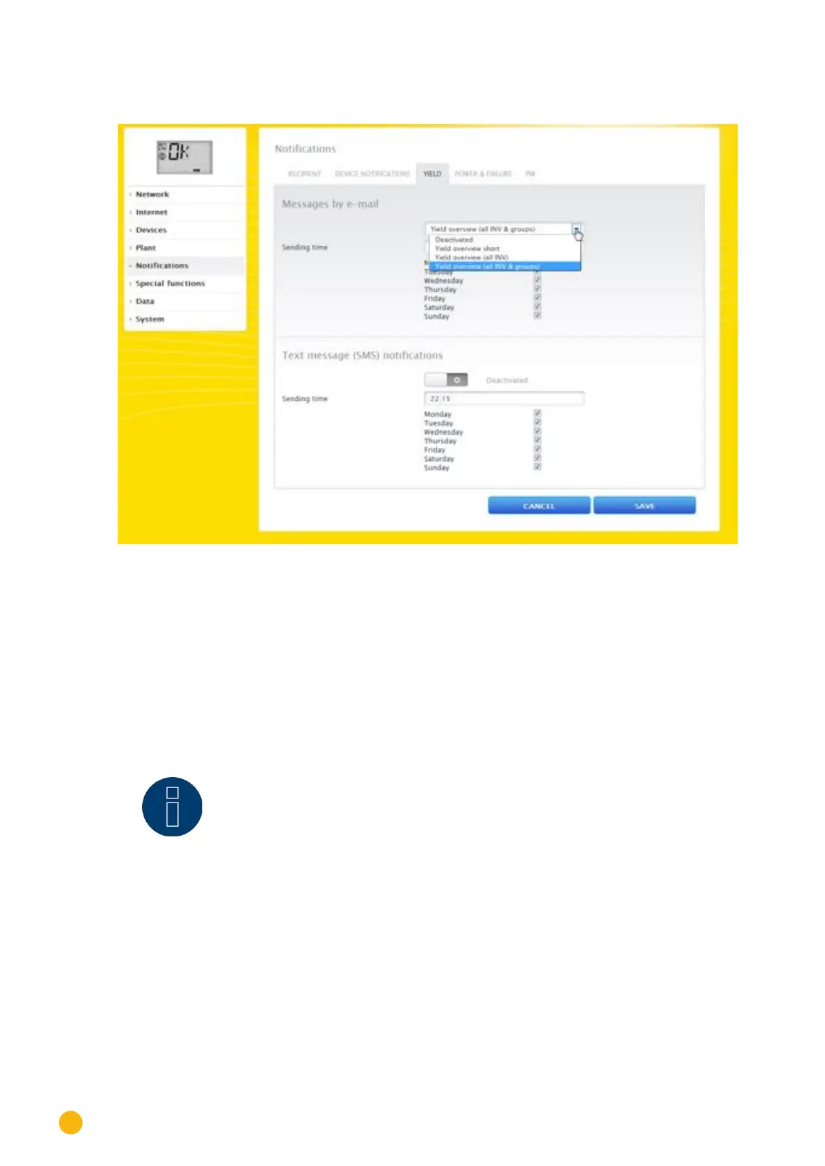 In the Yield tab, you can define yield notifications per e-mail or text message (SMS).