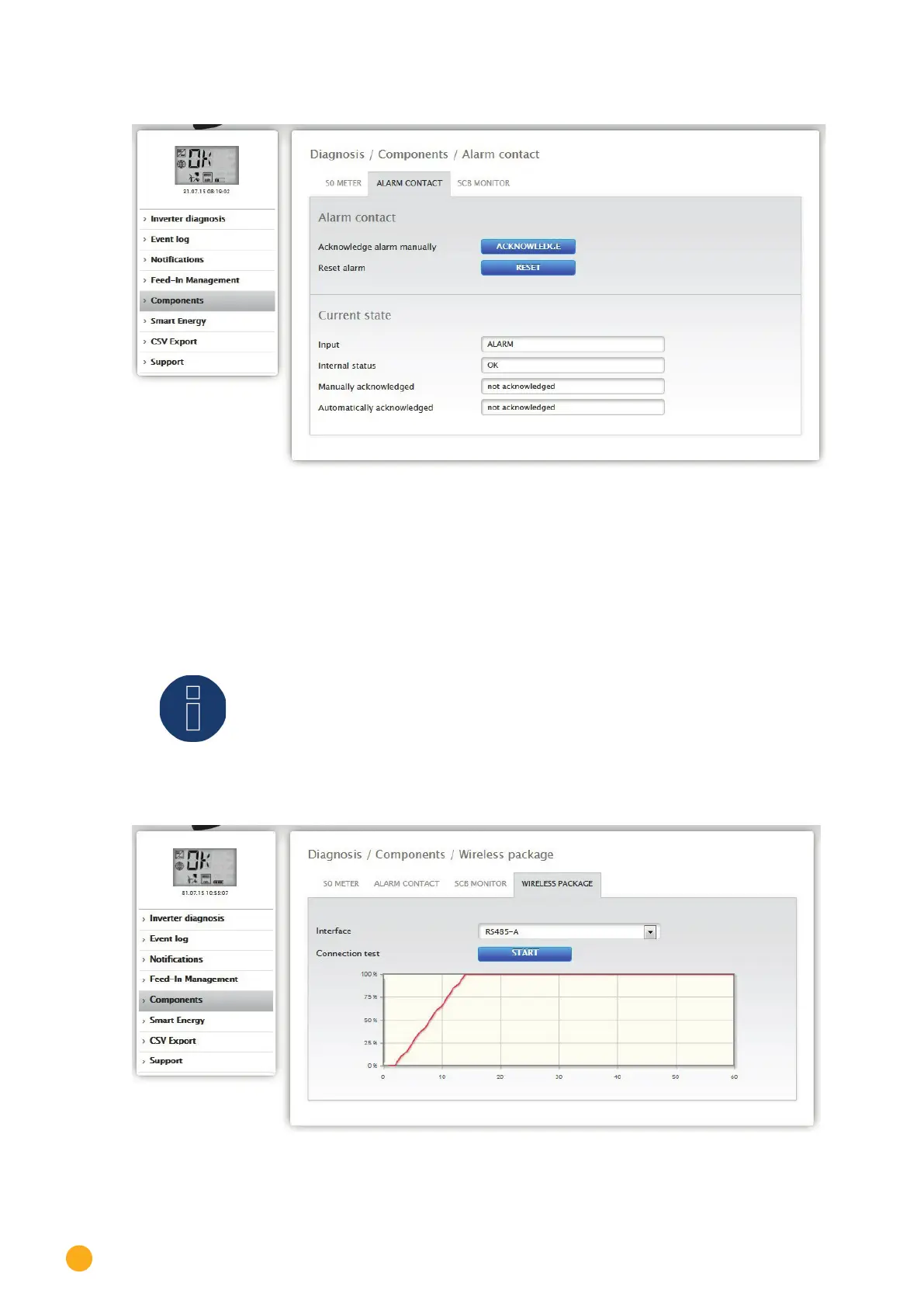 The Diagnostic | Components | Alarm contact menu is displayed in a split-screen window.