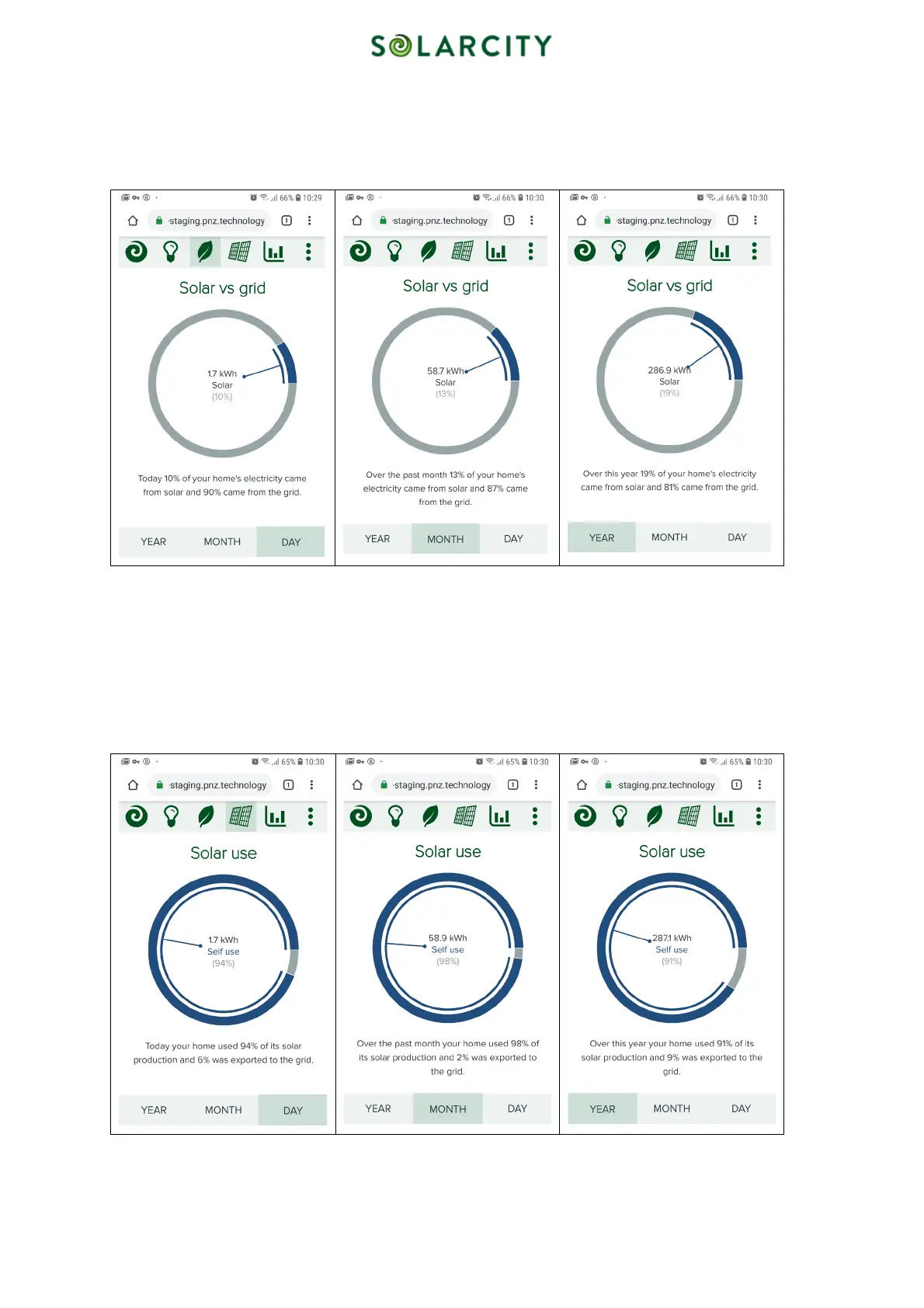 The “Solar vs grid” screen shows the fractions of solar power and grid power that you power usage consists of and can