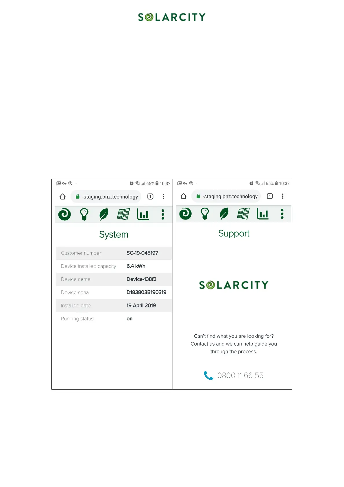 The Support screen displays the solarcity phone number that you can call if you have any questons or if you are