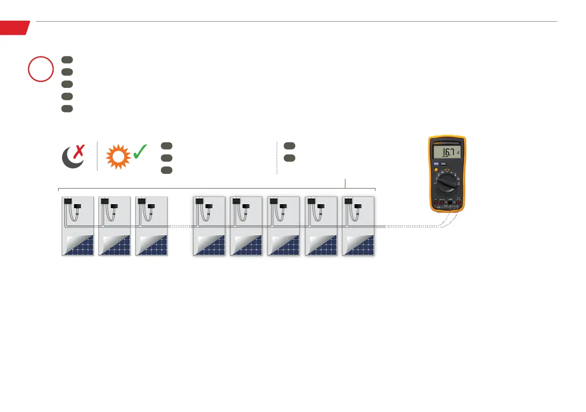 스트링 극성을 확인하고 옵티마이저당 1V을 입증하기 위해서 각 스트링의 전압을 측정하세요