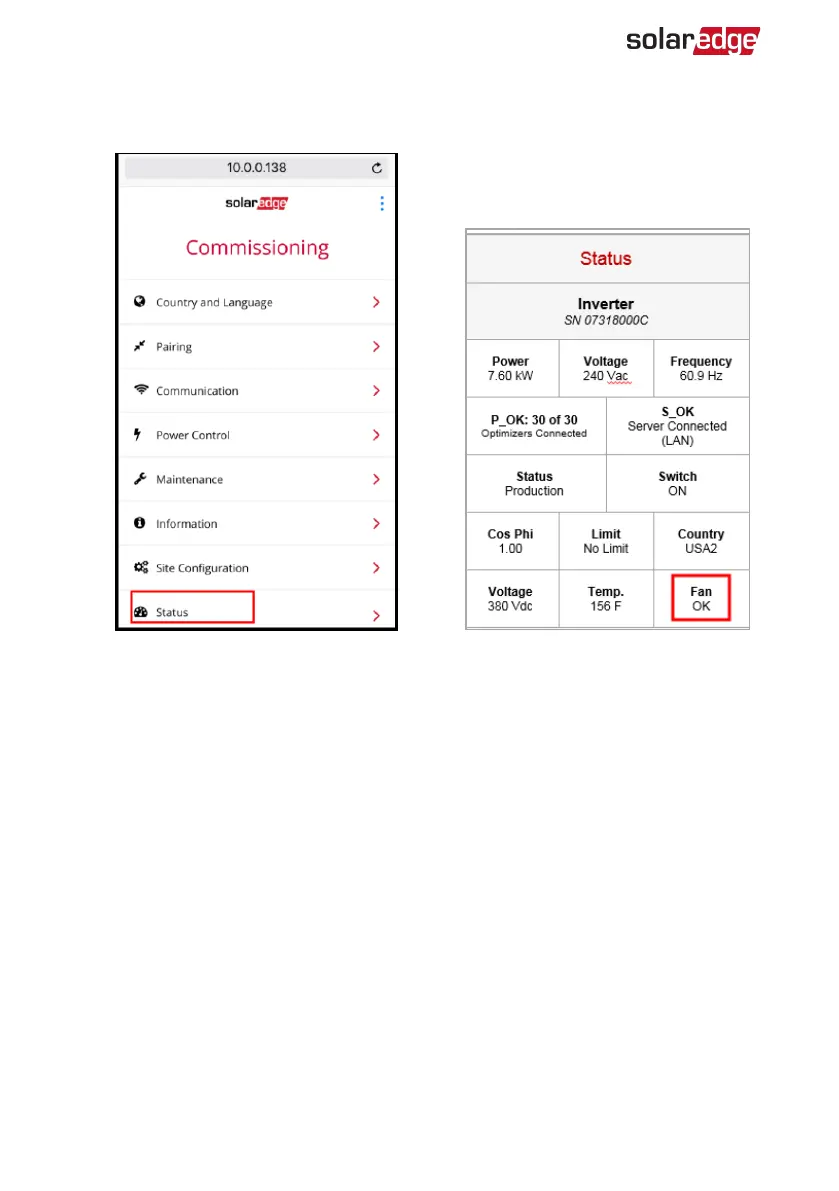 After powering up the inverter, check the fan status on SetApp: Select