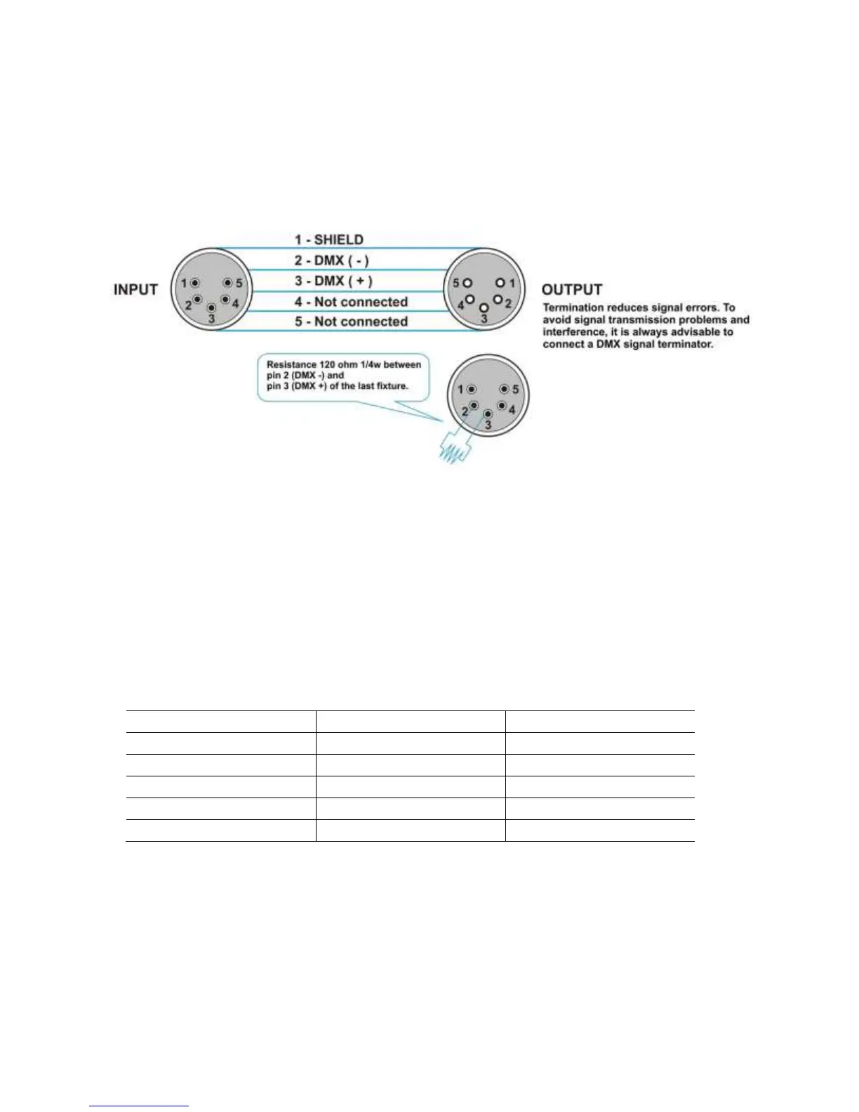 If using a console with a 3-pin DMX output connector, a 3-pin to 5-pin adapter is needed. The chart below details