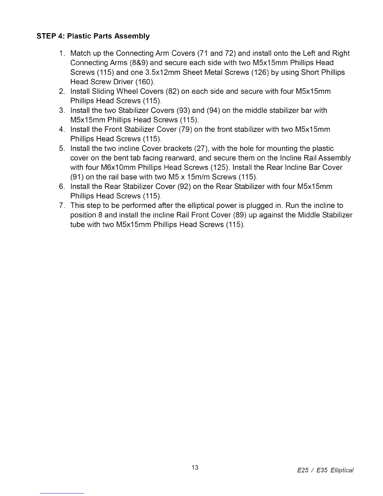 with four M6xl0mm Phillips Head Screws (125). Install the Rear Incline Bar Cover