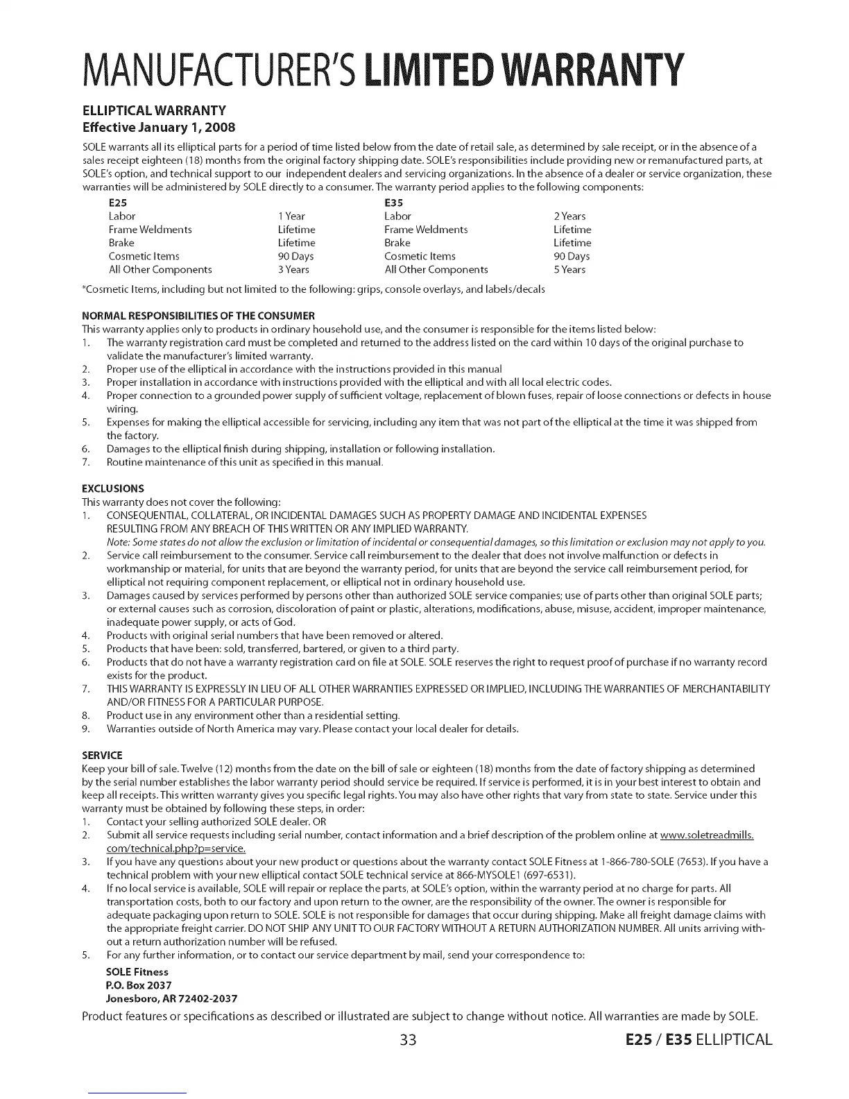 4. If no local service is available, SOLE will repair or replace the parts, at SOLE's option, within the warranty period at no charge for parts. All