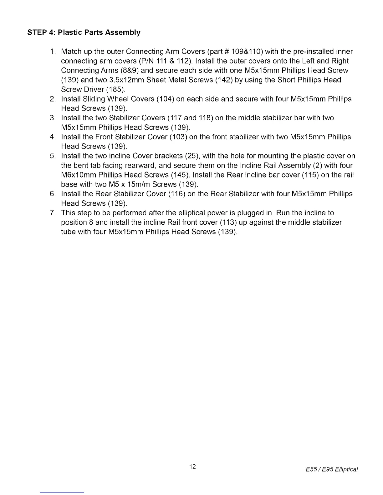 M6xl0mm Phillips Head Screws (145). Install the Rear incline bar cover (115) on the rail