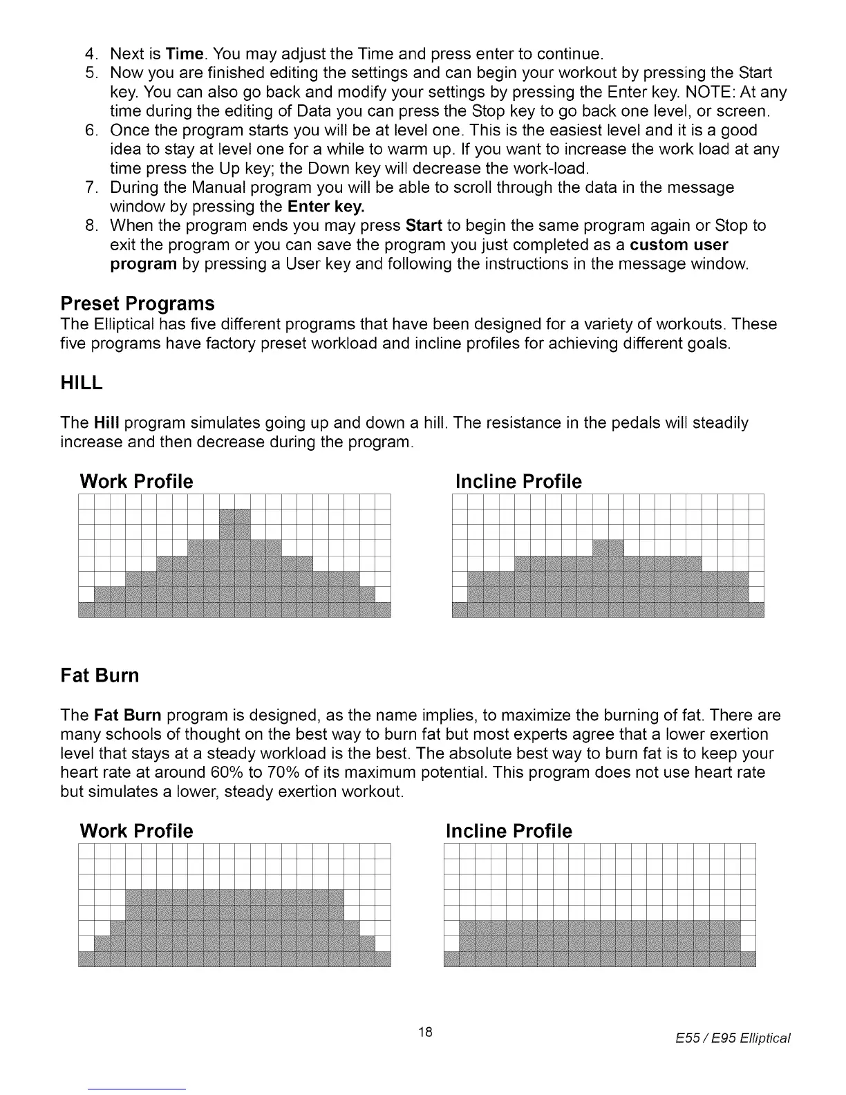five programs have factory preset workload and incline profiles for achieving different goals.