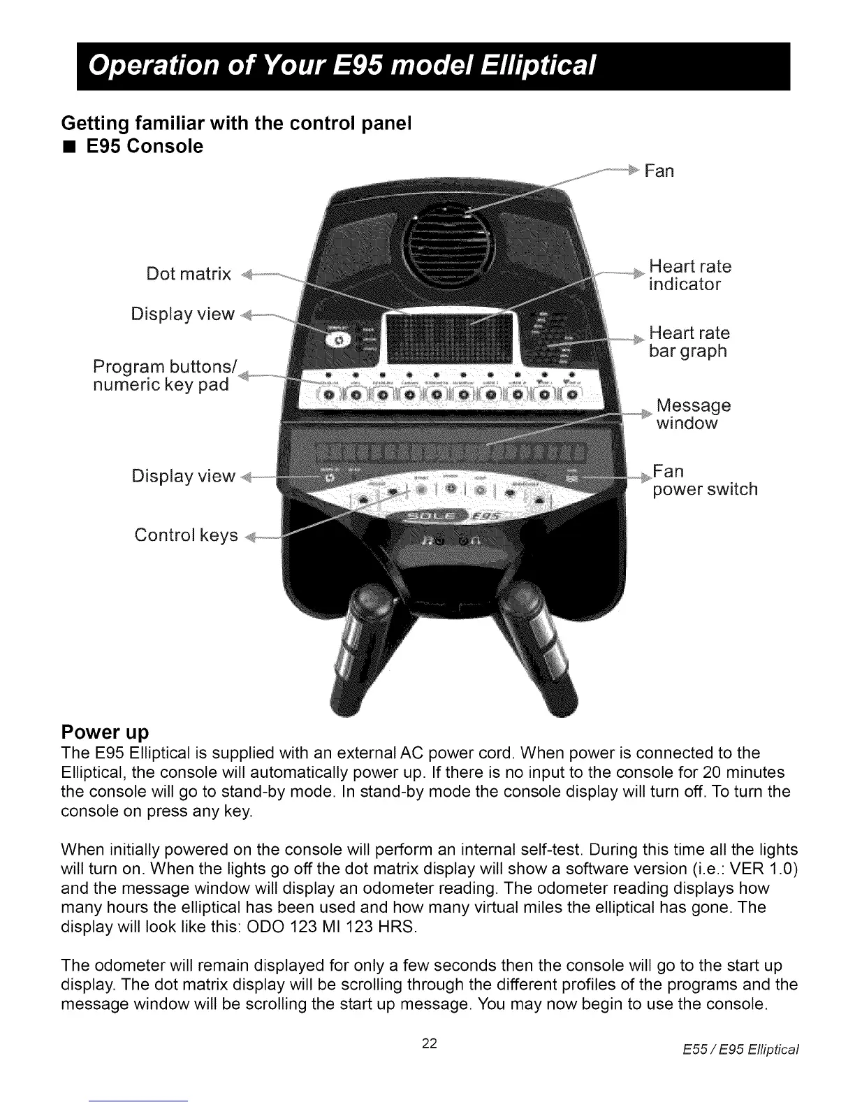 The E95 Elliptical is supplied with an external AC power cord. When power is connected to the