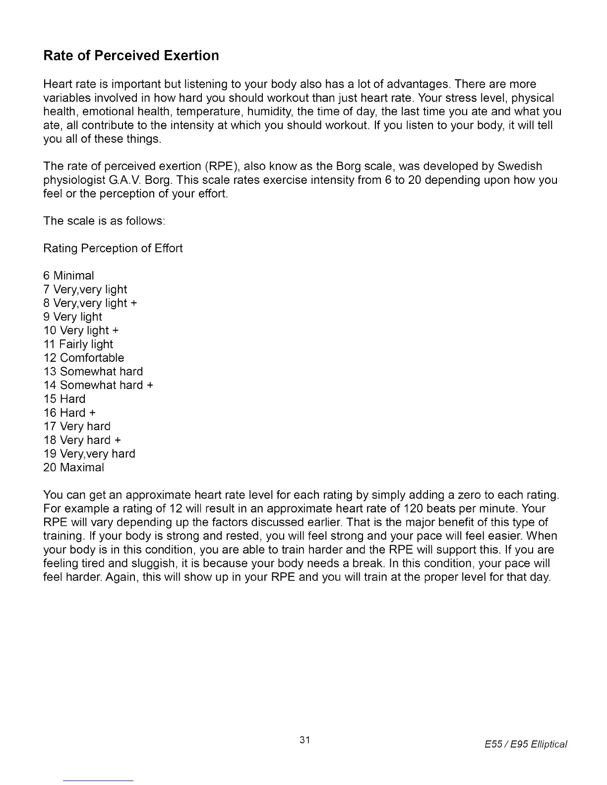physiologist G.A.V. Borg. This scale rates exercise intensity from 6 to 20 depending upon how you