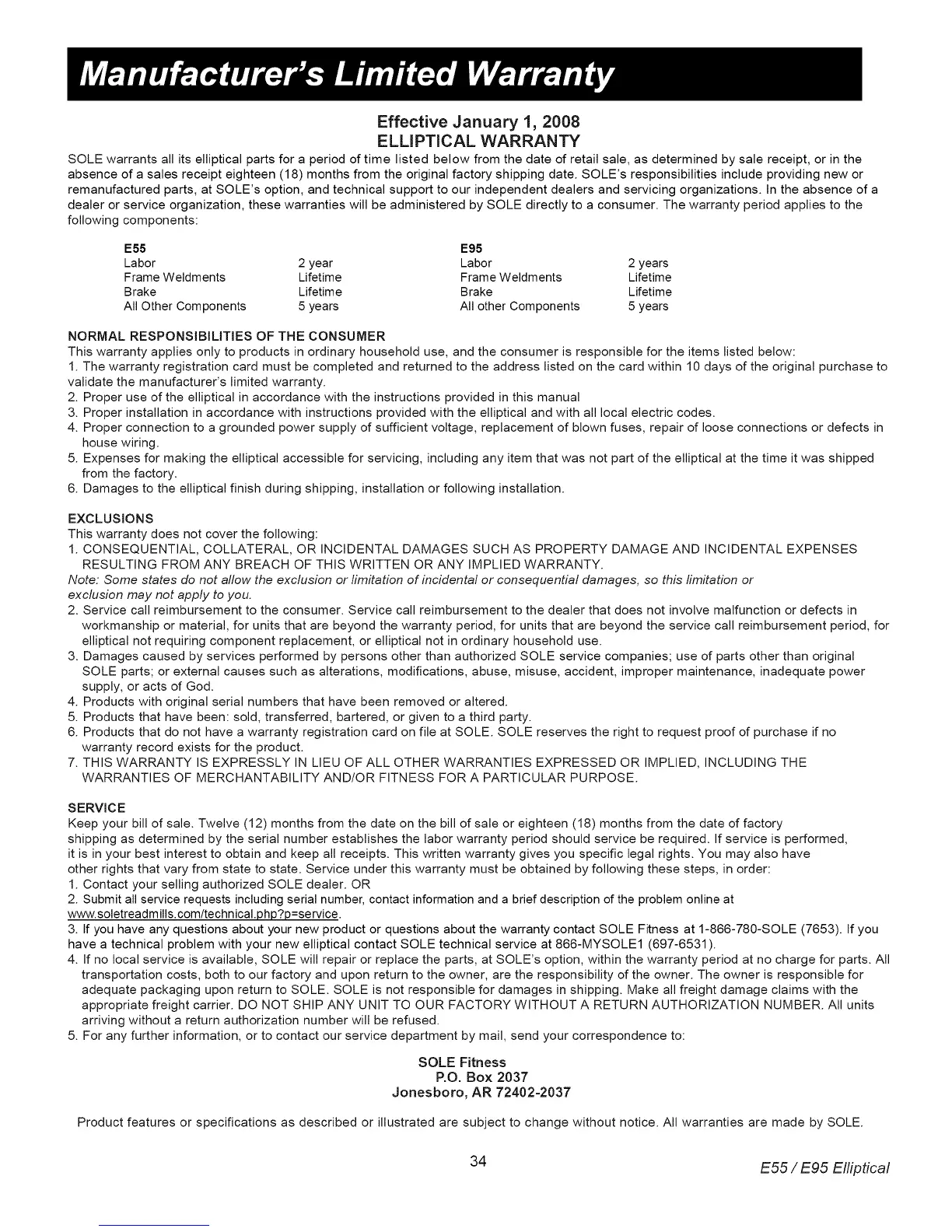 4. If no local service is available, SOLE will repair or replace the parts, at SOLE's option, within the warranty period at no charge for parts. All