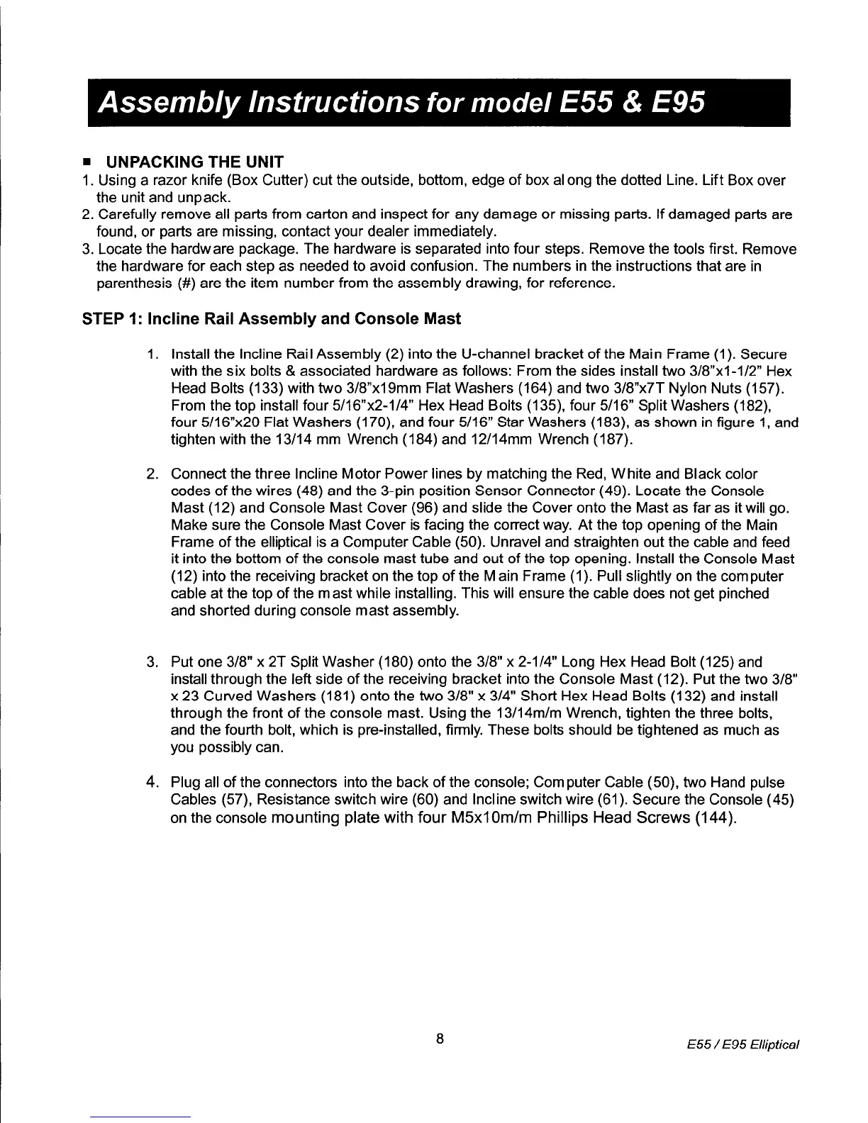 SOLE E95 - Unpacking the Unit; Incline Rail Assembly and Console Mast