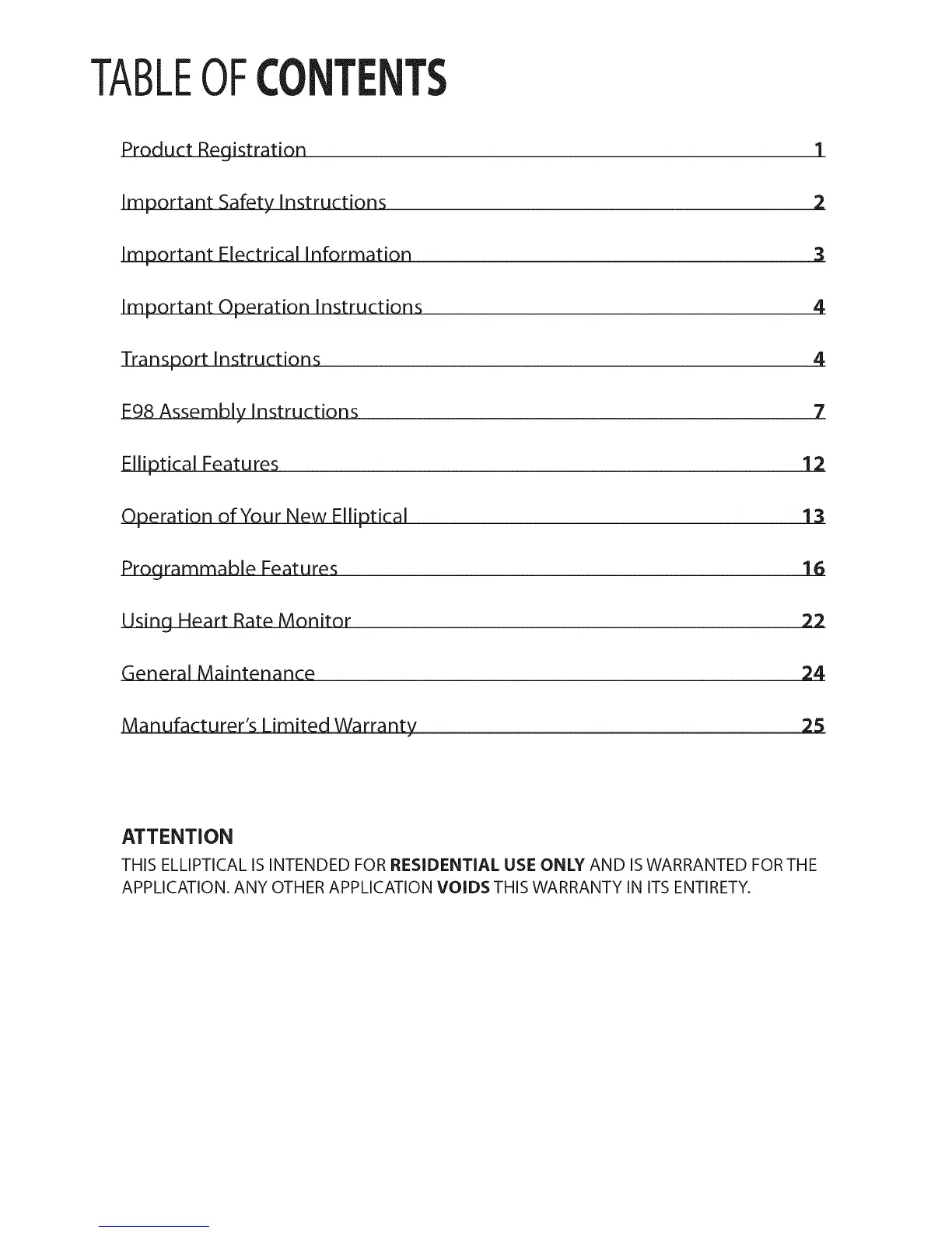 THIS ELLIPTICAL ISINTENDED FOR RESIDENTIAL USE ONLY AND ISWARRANTED FORTHE