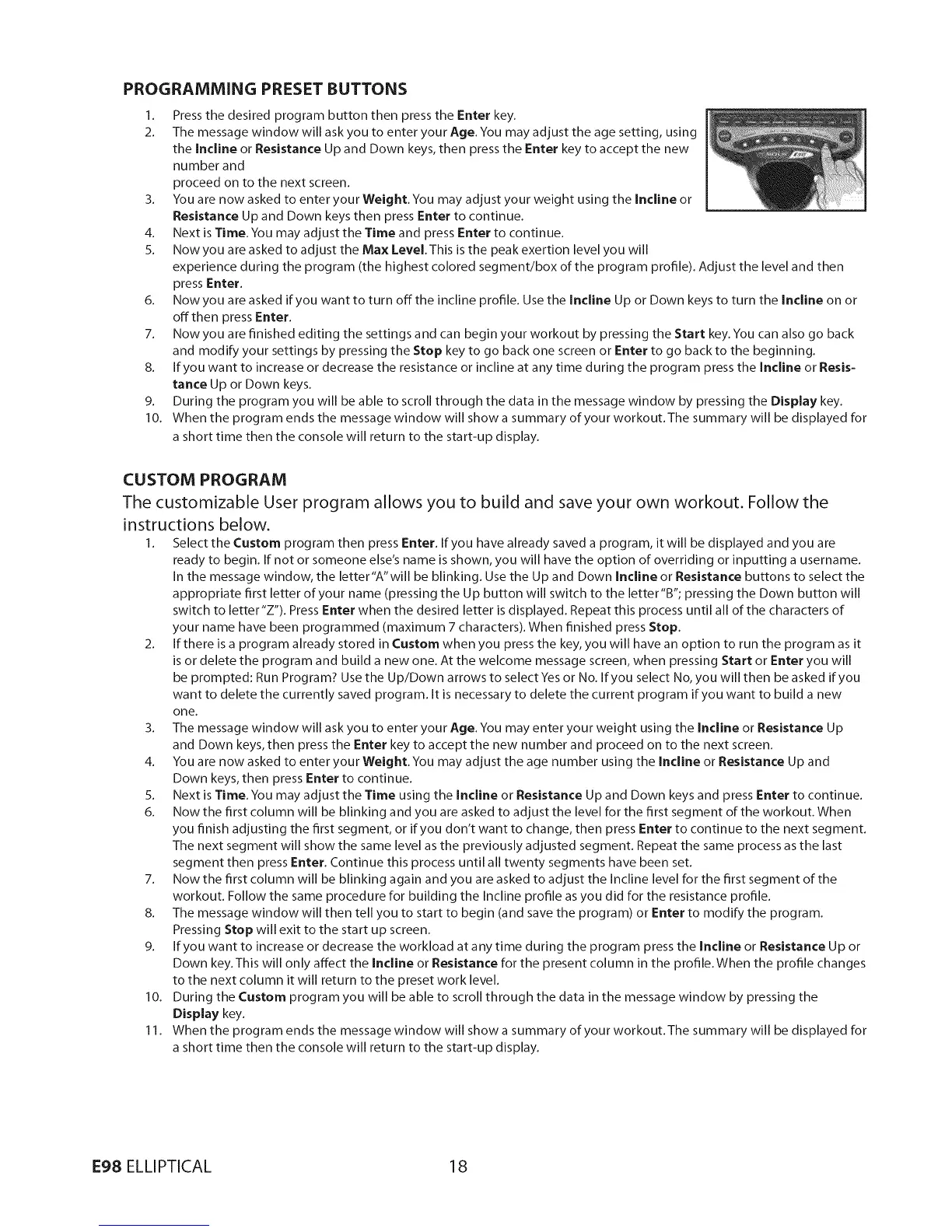 9. If you want to increase or decrease the workload at any time during the program press the Incline or Resistance Up or