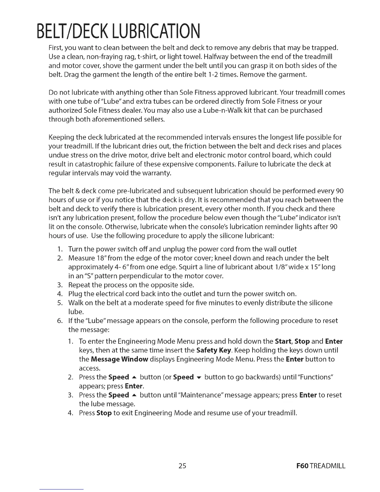 Do not lubricate with anything other than Sole Fitness approved lubricant. Your treadmill comes