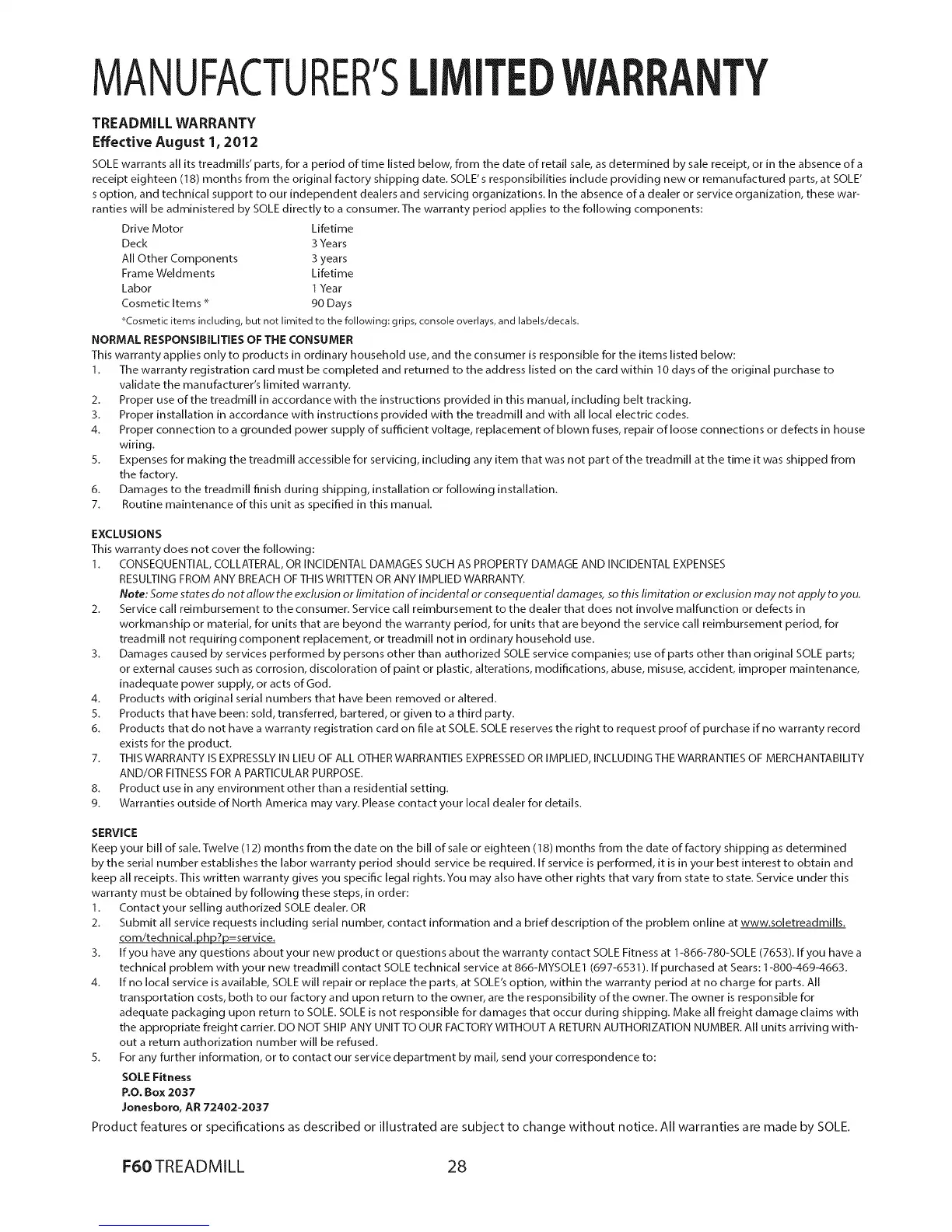 4. If no local service is available, SOLE will repair or replace the parts, at SOLE's option, within the warranty period at no charge for parts. All