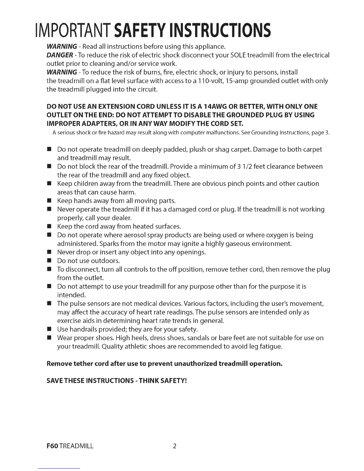 Remove tether cord after use to prevent unauthorized treadmill operation.