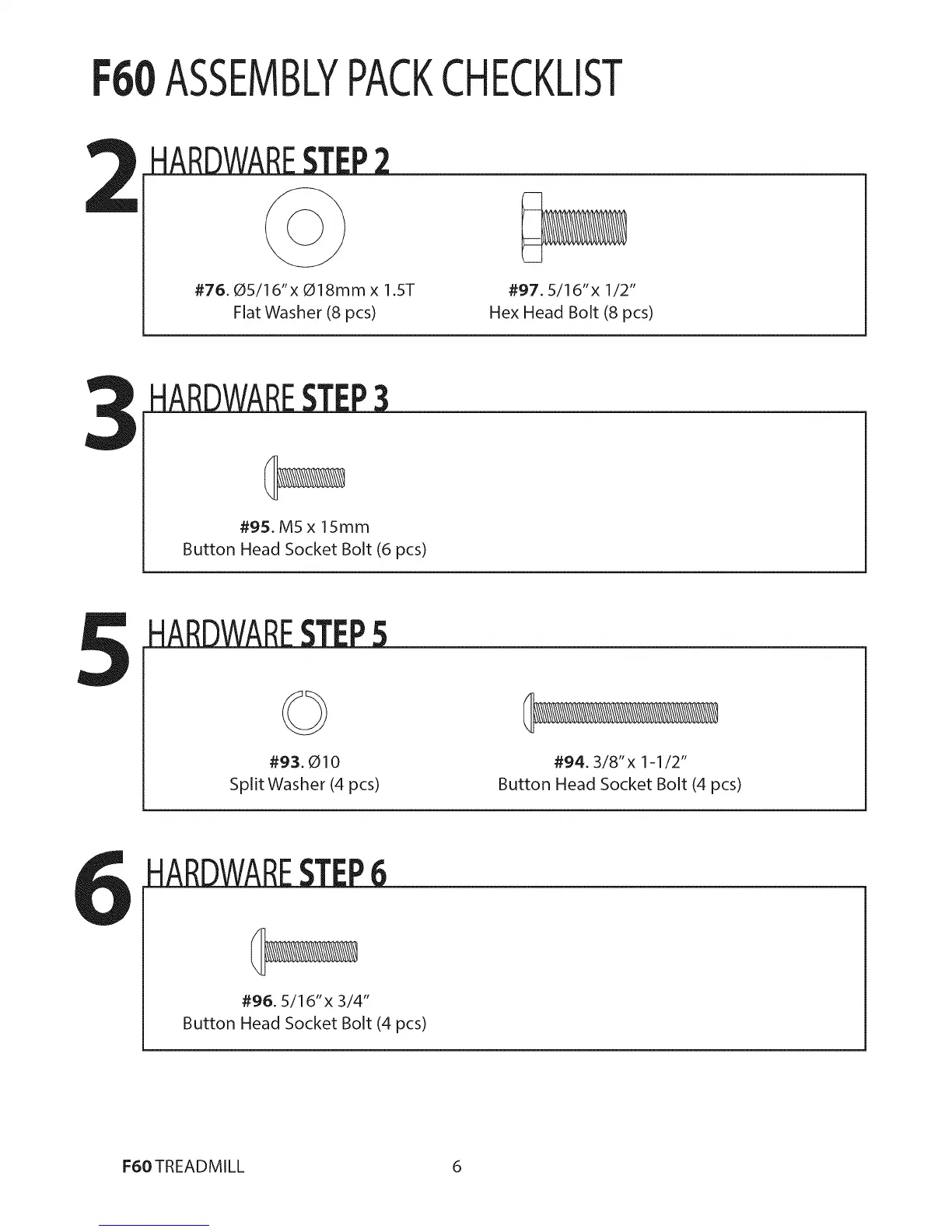 SOLE F60 - Assembly Preparation; Assembly Hardware Checklist