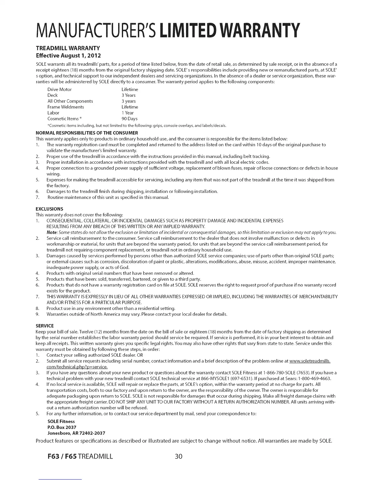 4. If no local service is available, SOLE will repair or replace the parts, at SOLE's option, within the warranty period at no charge for parts. All